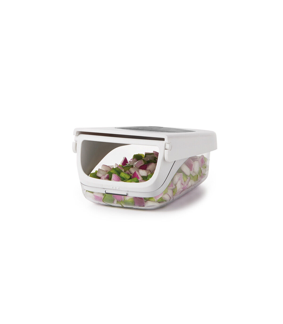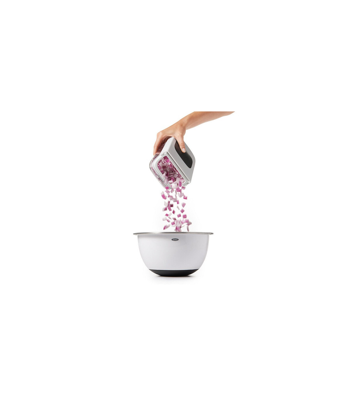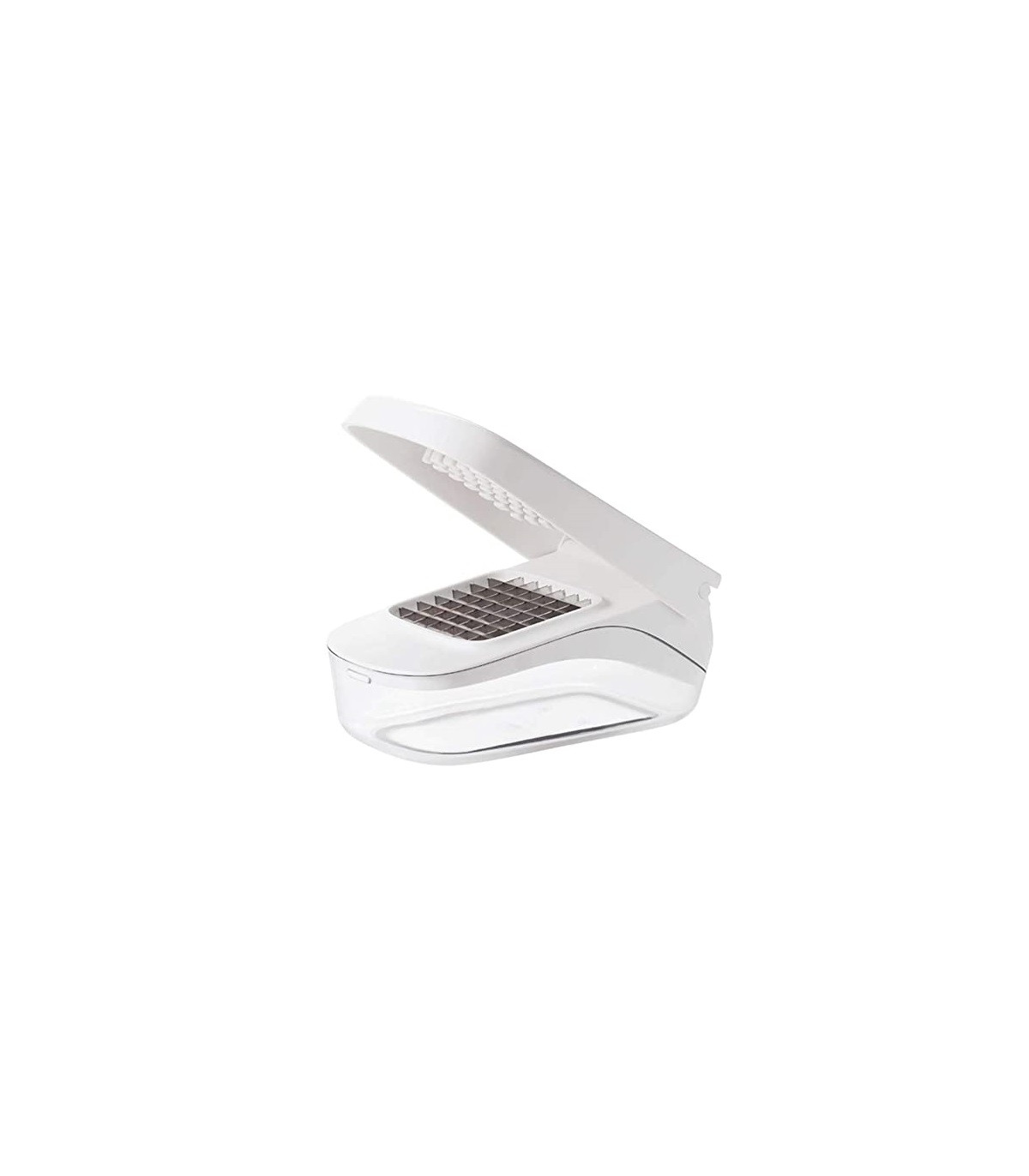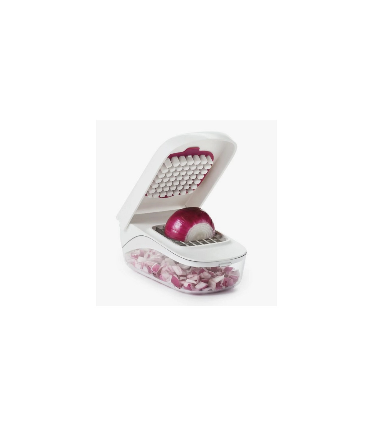 ¡No más lágrimas! Pica cebollas, pimientos y más de forma rápida y segura con un solo movimiento, y vierte fácilmente frutas o verduras picadas sin quitar la tapa. El patrón de cuchillas de acero inoxidable y el área de corte empotrada mantienen los alimentos en su lugar, mientras que la tapa proporciona palanca para picar eficientemente.