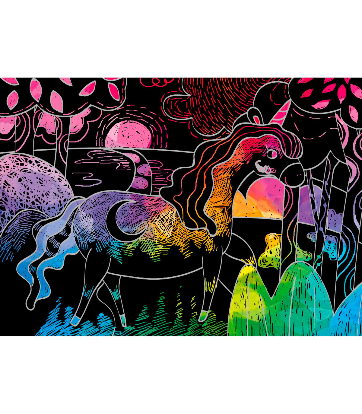 Un divertido minilibro de arte para raspar con 15 páginas llenas de unicornios para que le agregues colores y decoraciones, usando el lápiz especial para raspar. Edad recomendada: + 3 años.