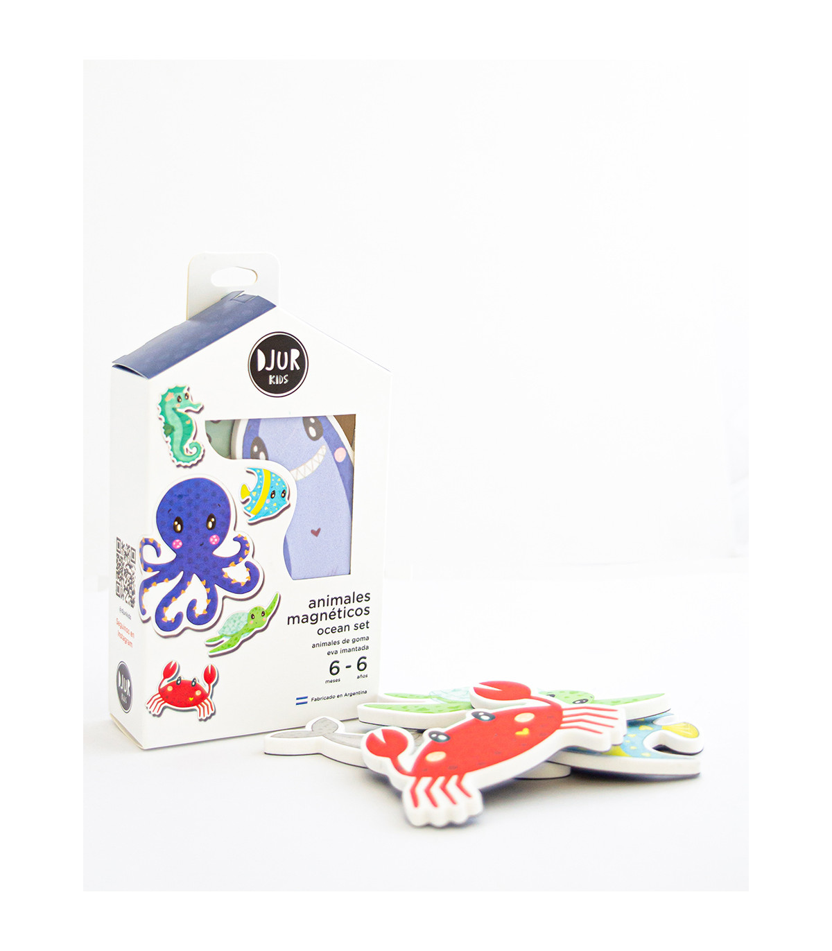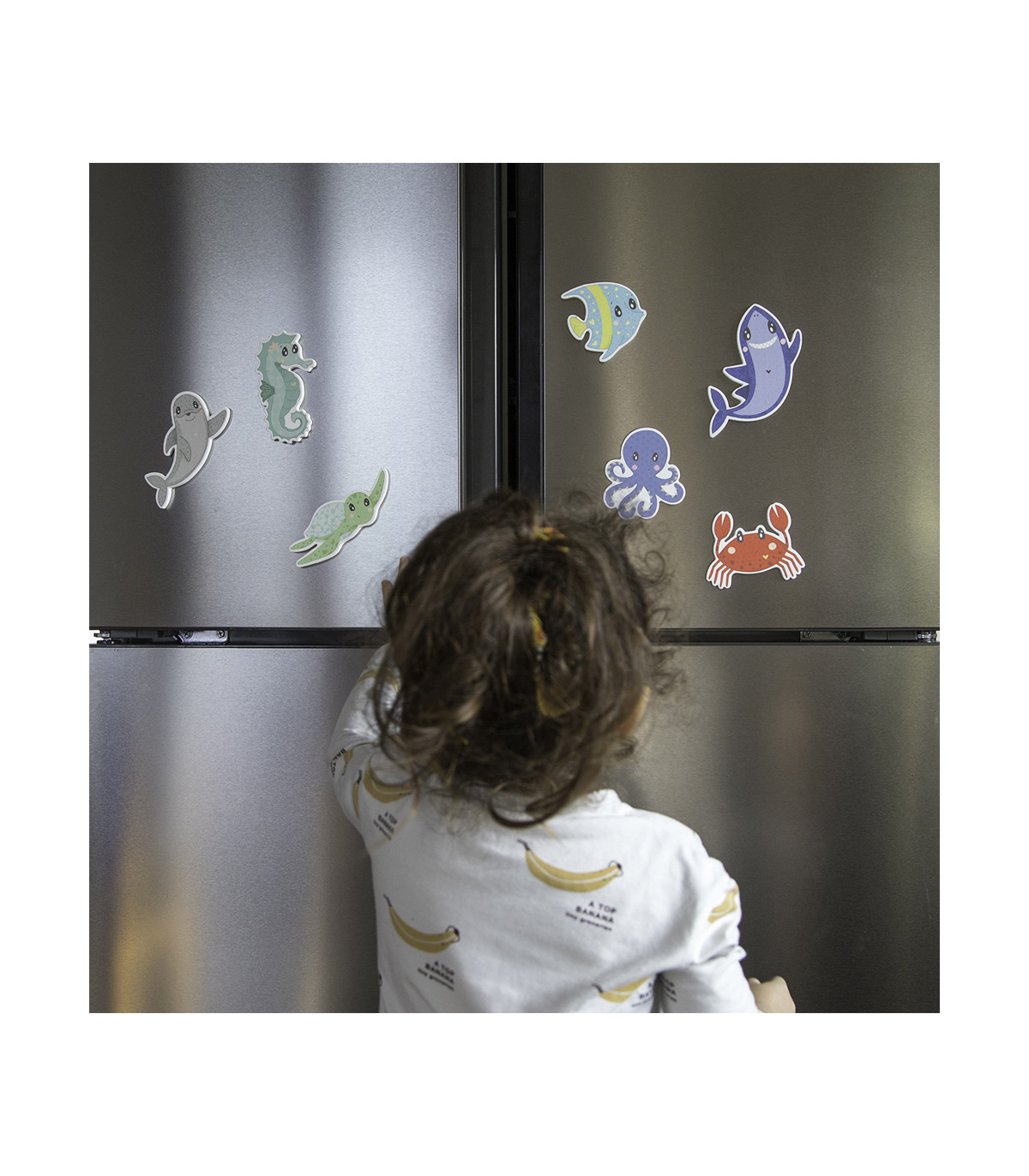 ¡Los animales de Djur Kids te acompañan por toda la casa! 7 animales de goma eva imantados: Hipocampo, Tiburón, Pulpo, Cangrejo, Pez, Delfín y Tortuga.