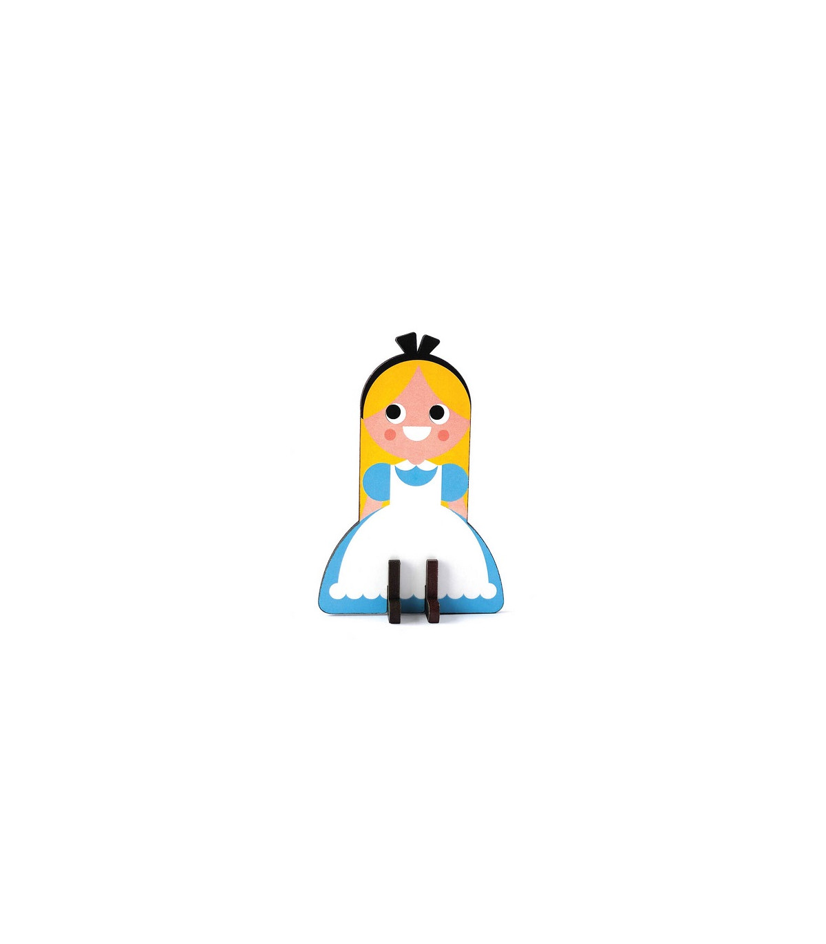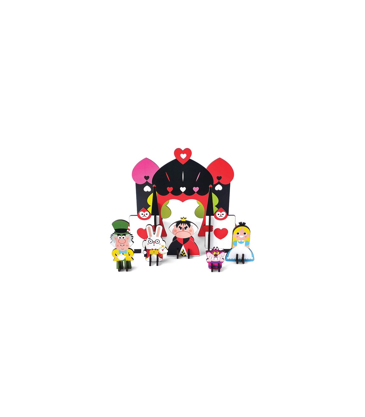 22 piezas para armar 1 Alicia, 1 reina de corazones, 1 sombrerero, 1 conejo blanco, 1 gato Cheshire, 2 naipes soldados, 1 castillo + frasquito con adhesivo vinílico | Material Madera 3 mm de espesor, laminada frente y dorso en papel ilustración, terminaci
