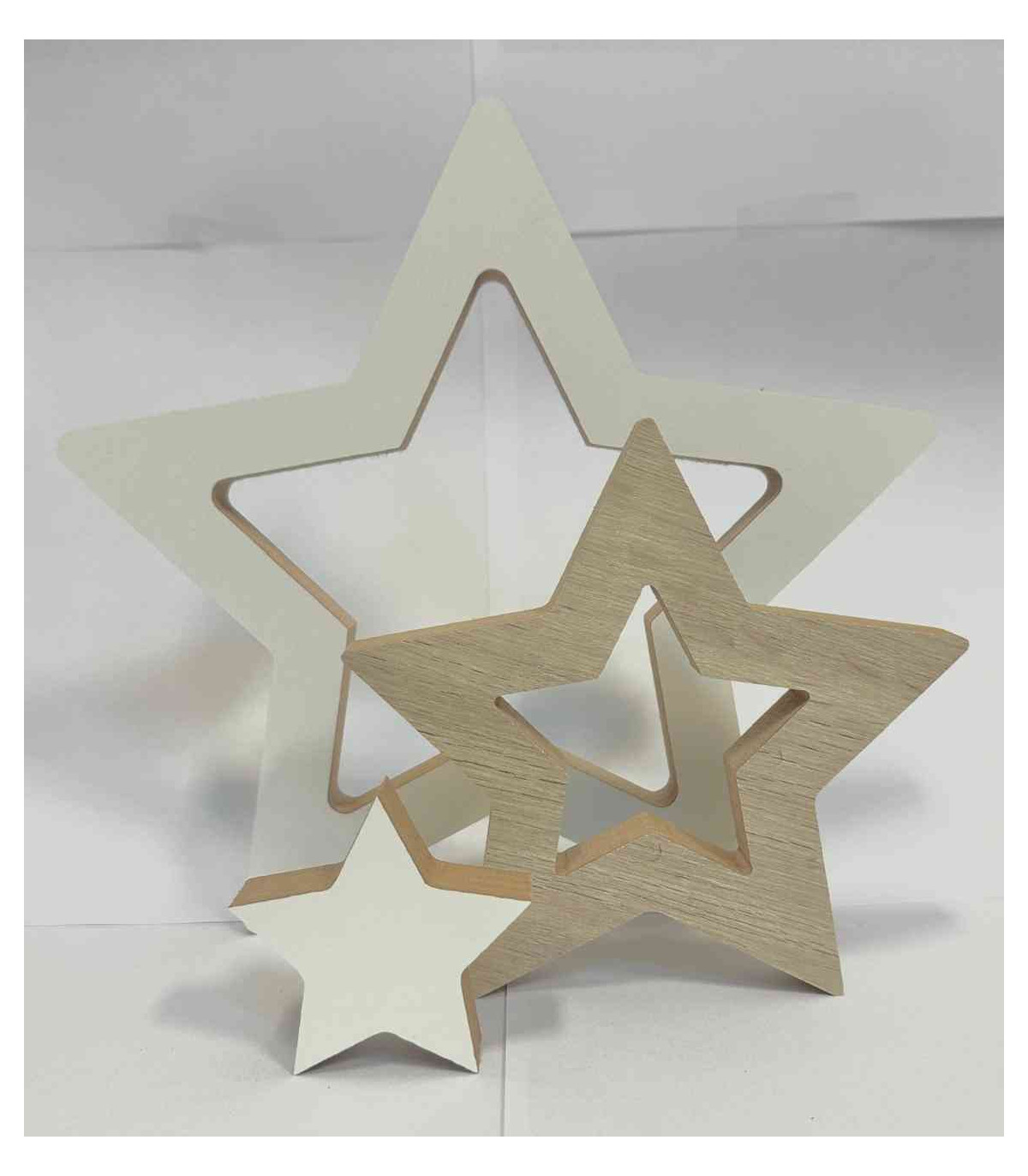 Un adorno de madera de 3 estrellas encastrables, una adentro de la otra, de 25 cm de alto. Ideal para decorar en Navidad.