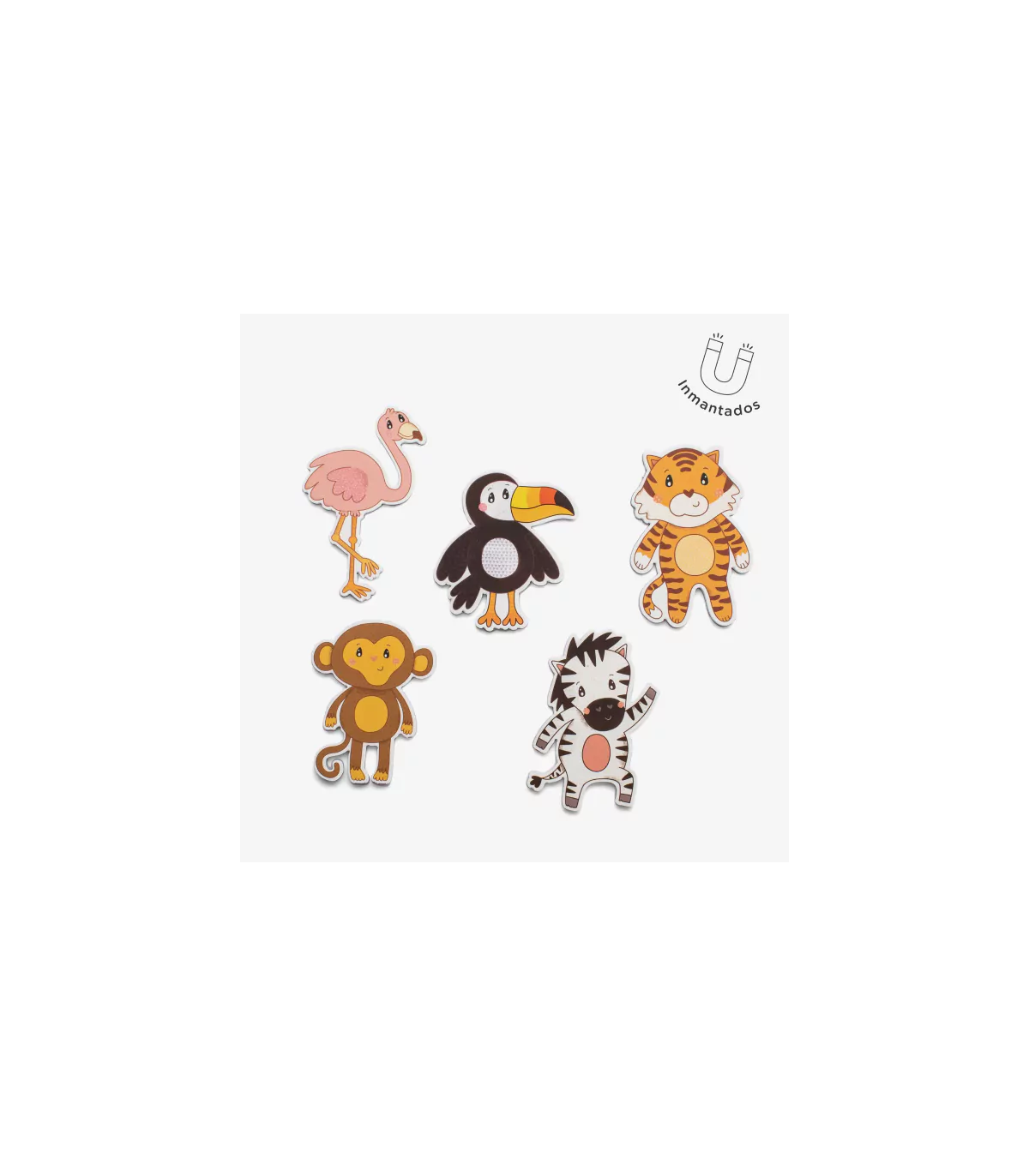 Incluye 5 animales imantados de goma eva + iman. Este producto esta certificado como juguete seguro y aprobado su uso a partir de los 6M.