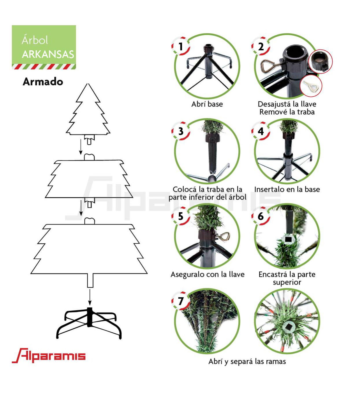 Árbol de Navidad Alparamis robusto y frondoso de 2.10 m de alto y 1468 puntas. Ramas articuladas que facilitan su armado. Base de hierro para mayor estabilidad. Forma de pino real. Ramas color marrón en el centro y agujas verdes con tratamiento ignífugo.