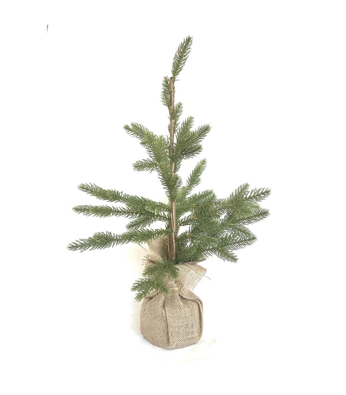 Un árbolito de Navidad de 50 cm de alto con ramas verdes y con base forrada en tela de yute. Ideal para decorar en Navidad.