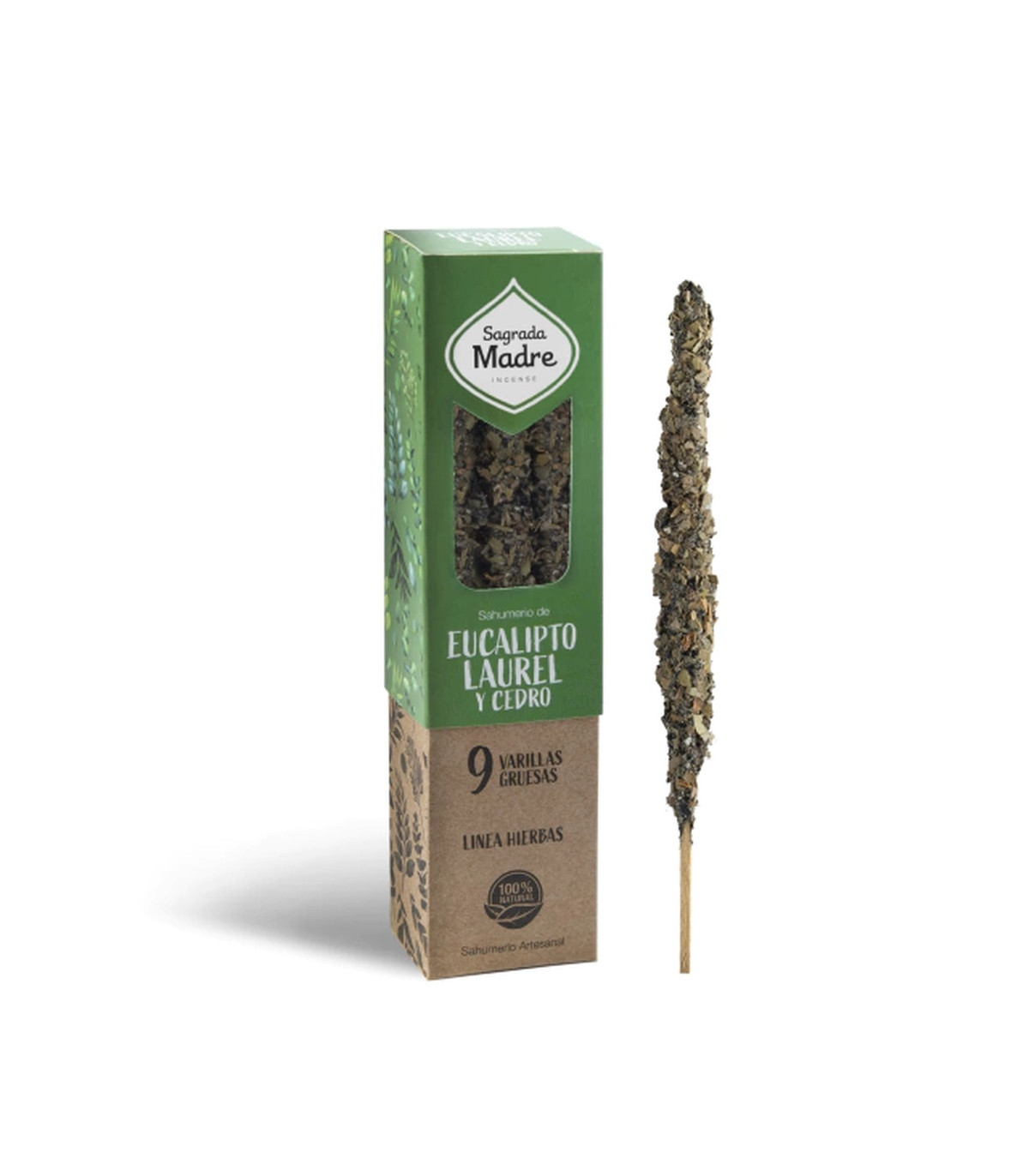 El Sahumerio Eucalipto - Laurel - Cedro combina tres poderosas hierbas con propiedades purificadoras y energizantes. Ideal para limpiar el aire, aliviar el estrés y fomentar la claridad mental. Perfecto para meditaciones, rituales de protección y crear un ambiente fresco y equilibrado. 100% natural.