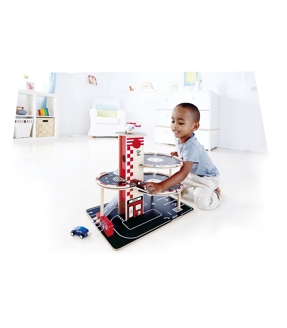 Con cuatro niveles de estacionamiento, tanques de nafta, un ascensor y una plataforma de aterrizaje en la terraza, los conductores ocupados irán y vendrán en todas las direcciones en este garage. Incluye 2 autos y 1 helicóptero de madera.