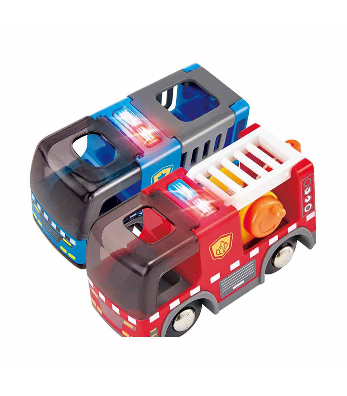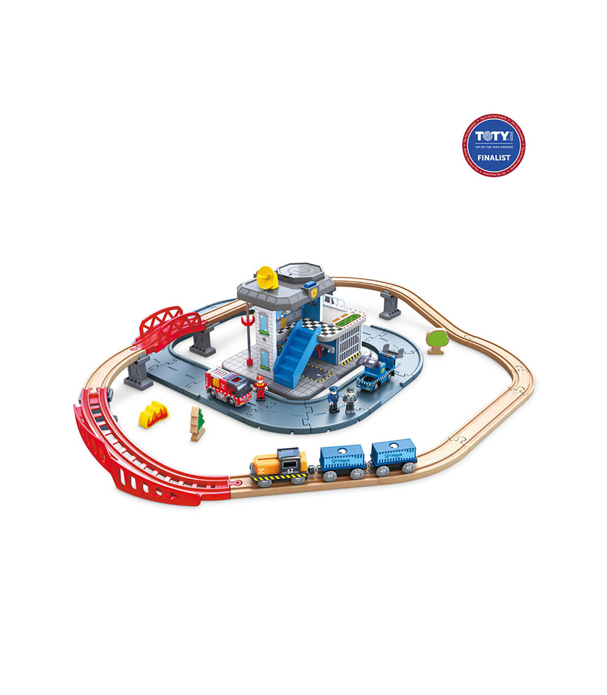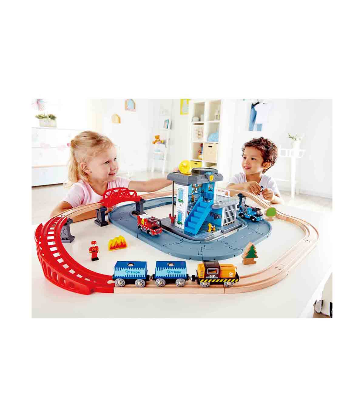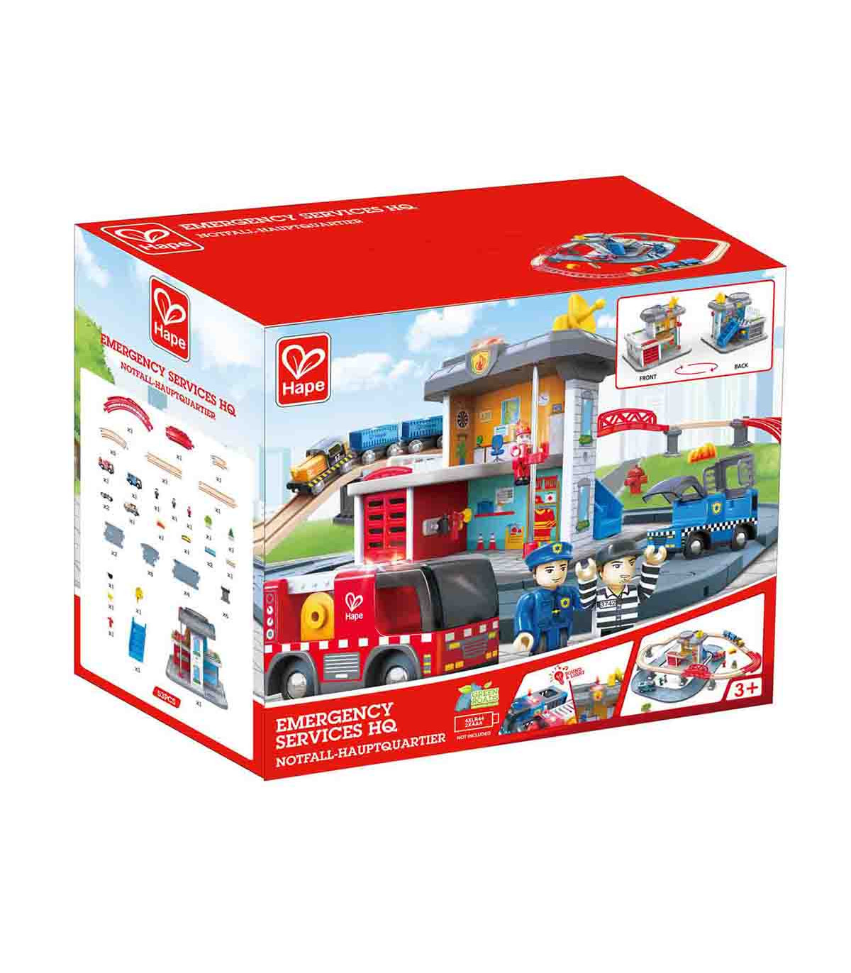 Mantené protegidas las carreteras y vías de tren con este set de servicios de emergencia. Contiene vehículos y una estación de policía y de bomberos.