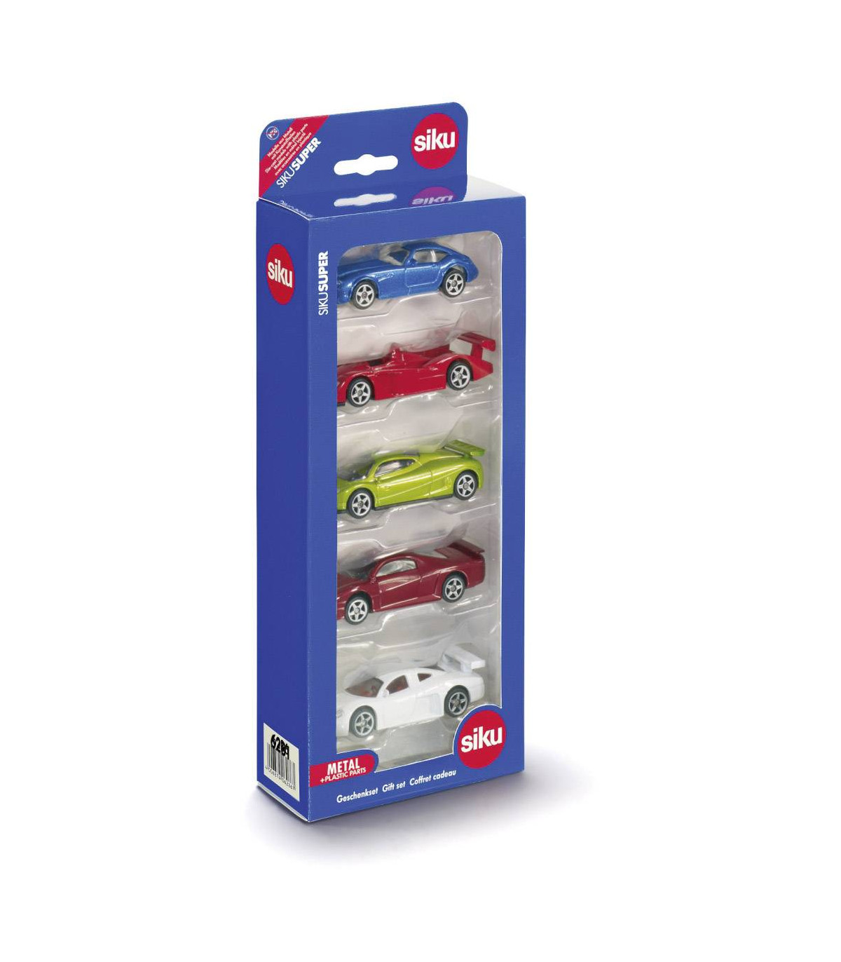 Cinco modelos actuales de automóviles siku en un atractivo juego de regalo.