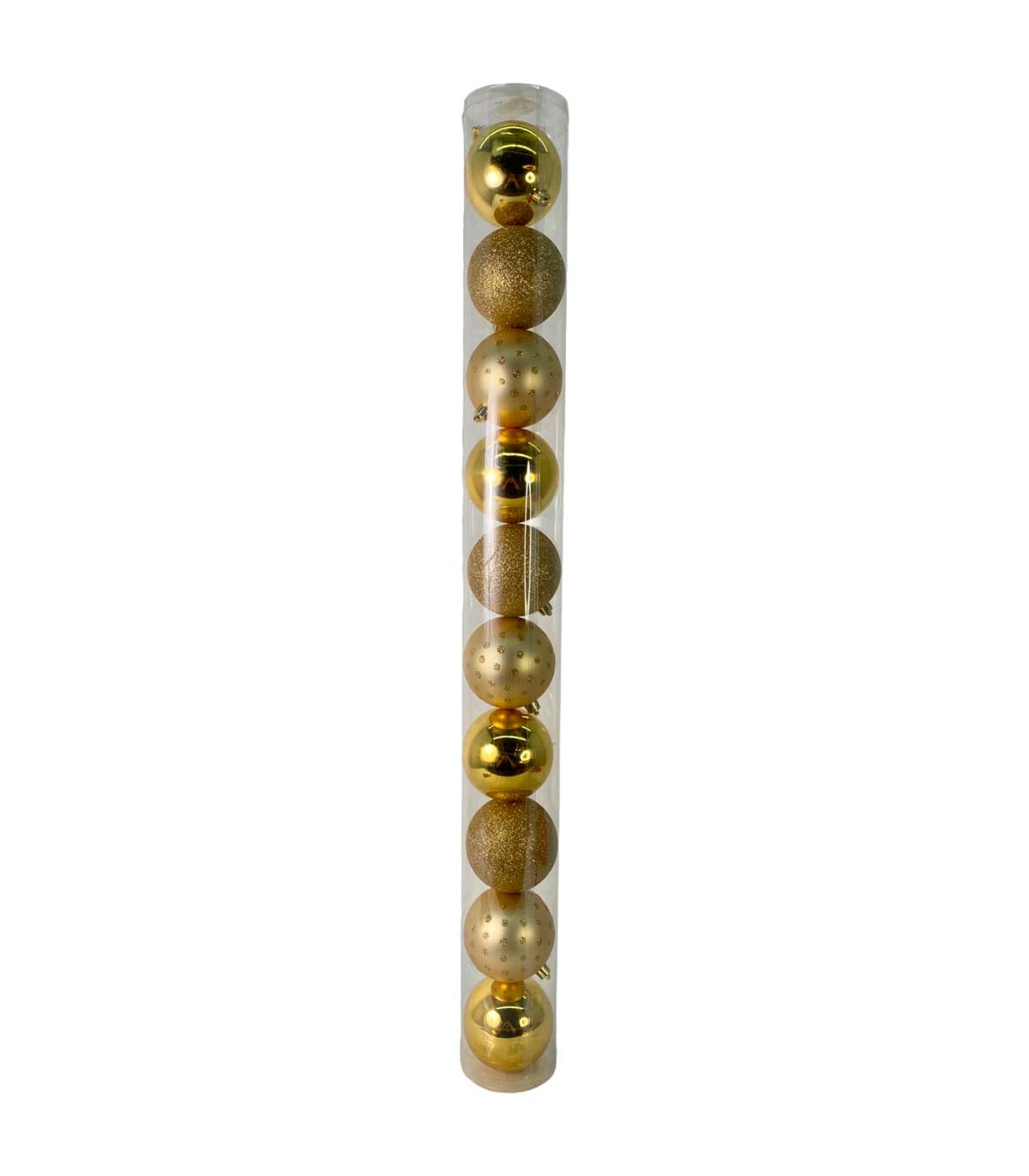 Un tubo de acetato transparente con 10 bolas navideñas de 8 cm de diámetro para decorar el árbol en Navidad.