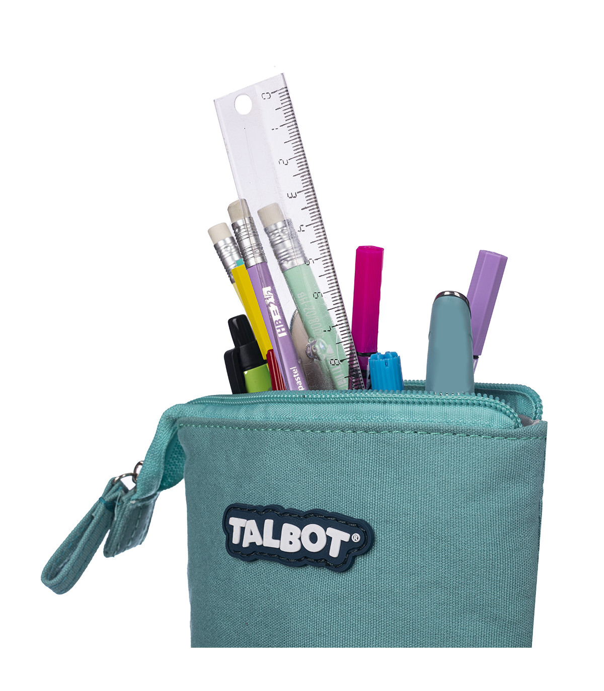 Una cartuchera práctica y canchera con un cierre superior que, al abrirse y plegarse, se puede usar como lapicero. El interior está forrado.