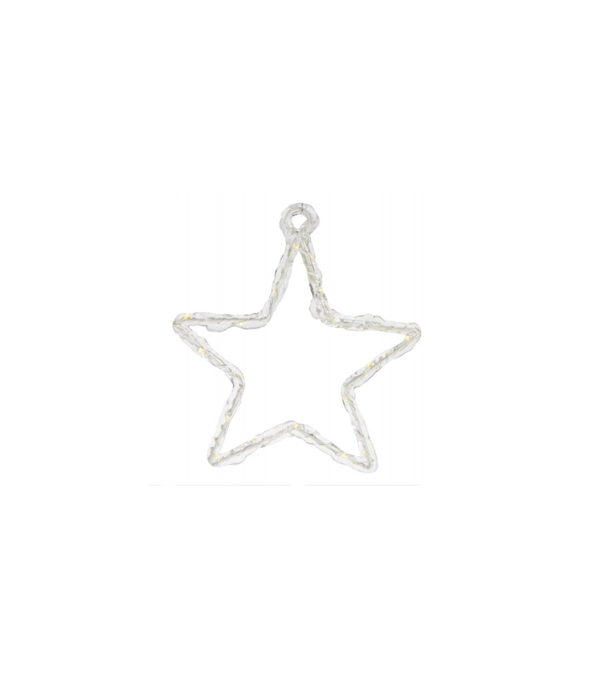 La estrella se puede colgar o colocar apoyada en algo. Para uso en interiores y al aire libre. La estructura en forma de estrella está hecha de un marco de metal recubierto de acrílico transparente con lámparas LED en su interior.