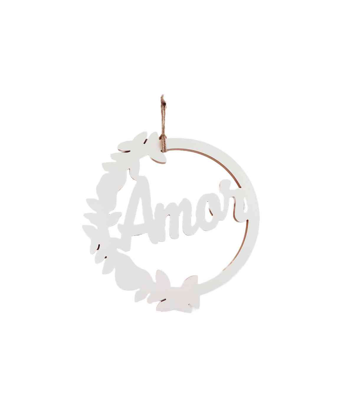 Una corona navideña de 40 cm de diámetro, hecha en madera con la palabra Amor calada. Incluye soga de yute para colgar. Hecha en madera recuperada de los sobrantes de muebles hechos a medida.