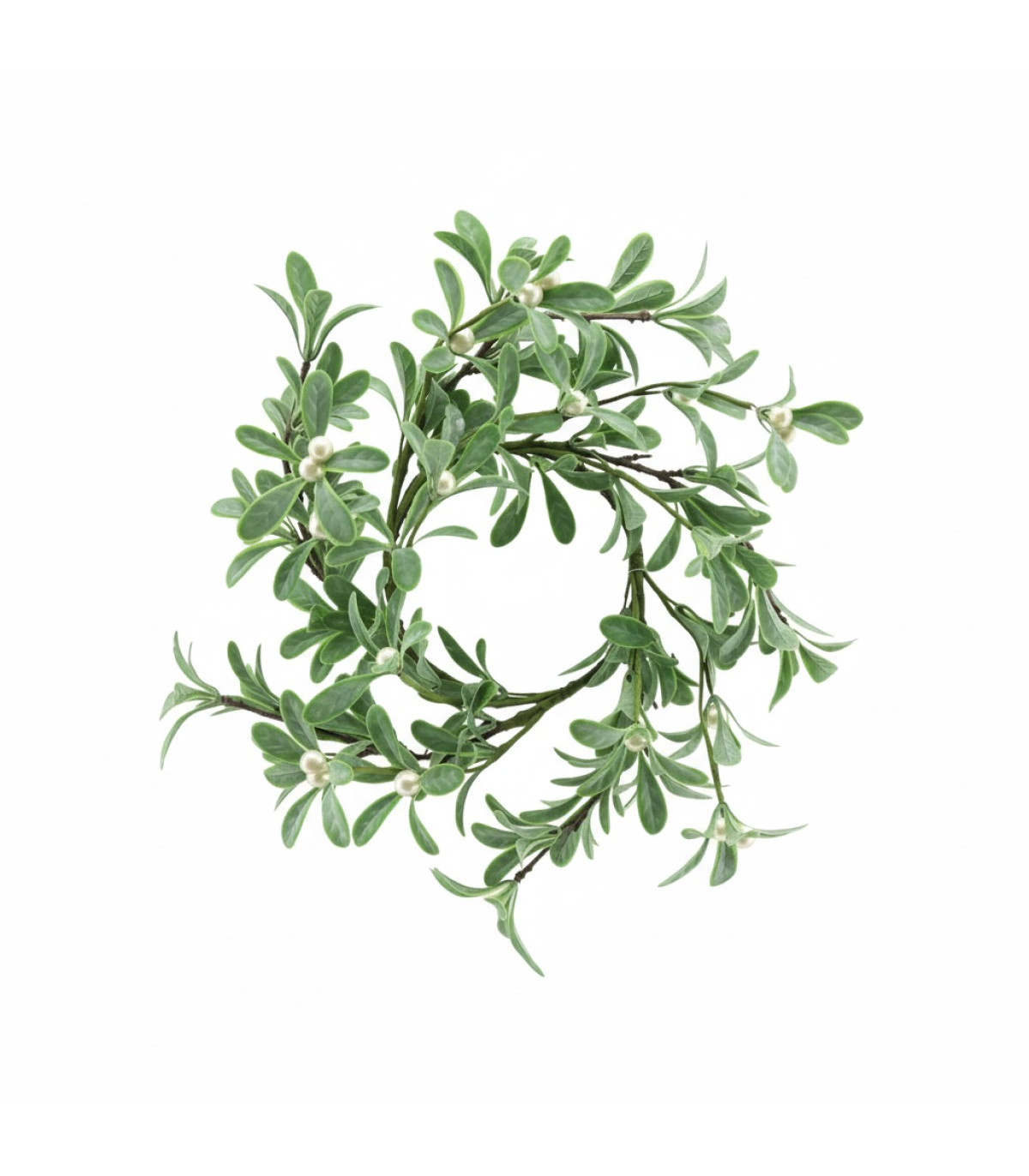 Una corona navideña de hojas verdes con perlas blancas de 11 cm de diametro. Ideal para centros de mesa o decoraciones elegantes. Añade brillo sutil a tu ambiente navideño.
