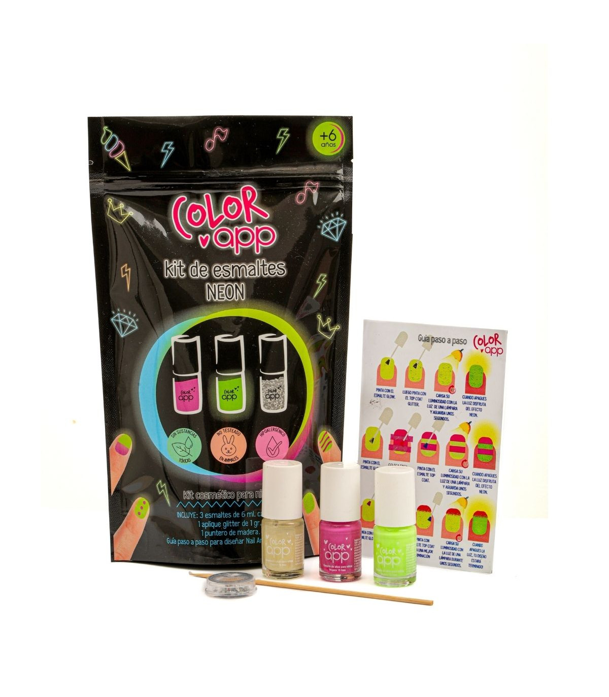 Contiene 3 Esmaltes Hipoergénicos de 4,5 ml cada uno, 2 Apliques Glitter de 1 gr. cada uno y 1 Puntero de madera para decorar.