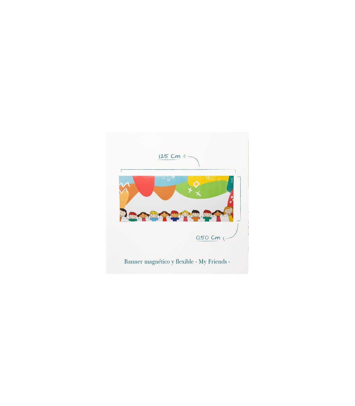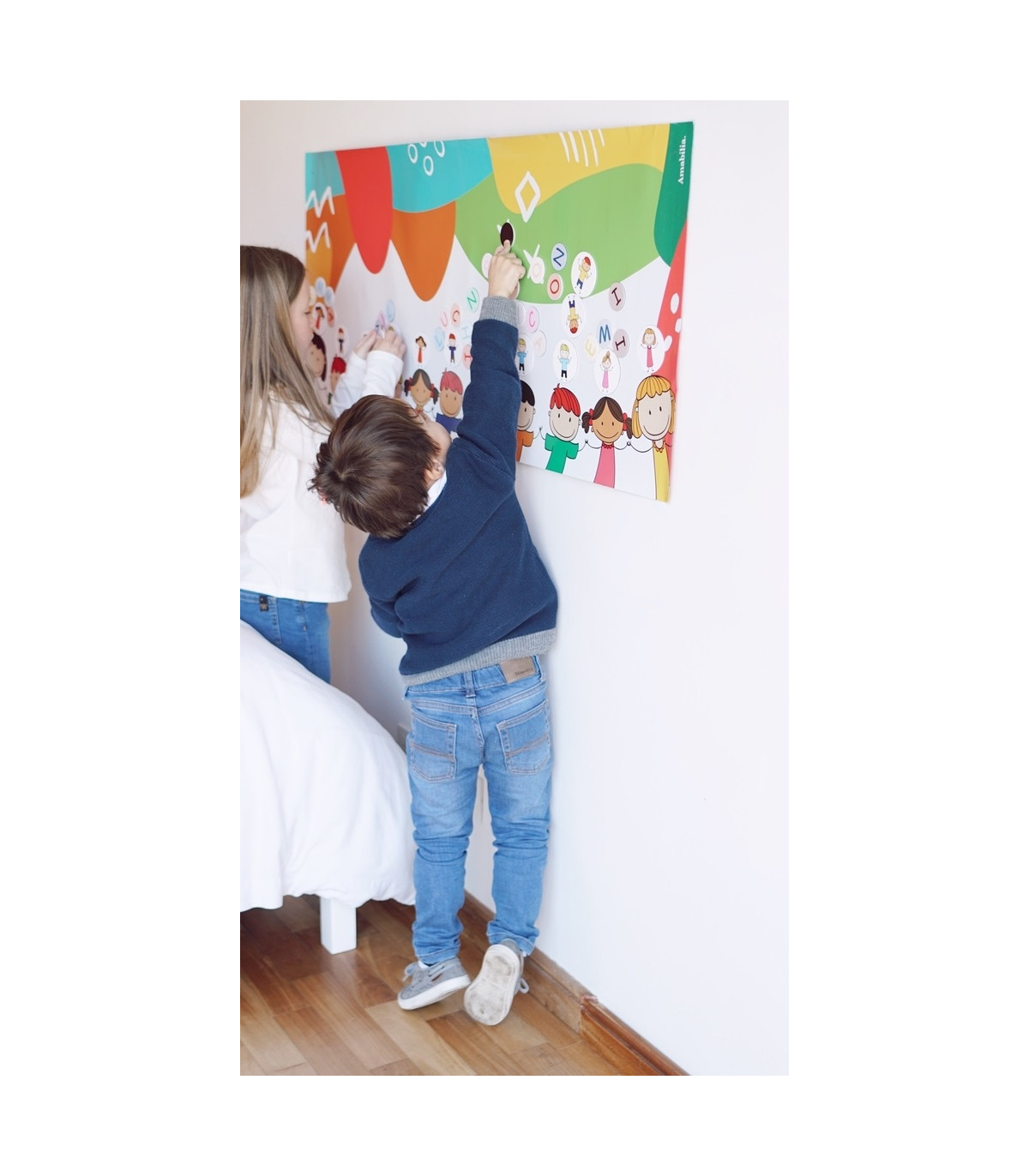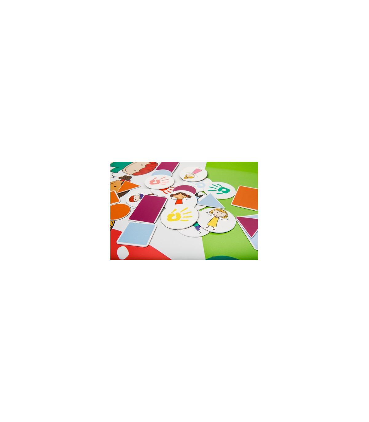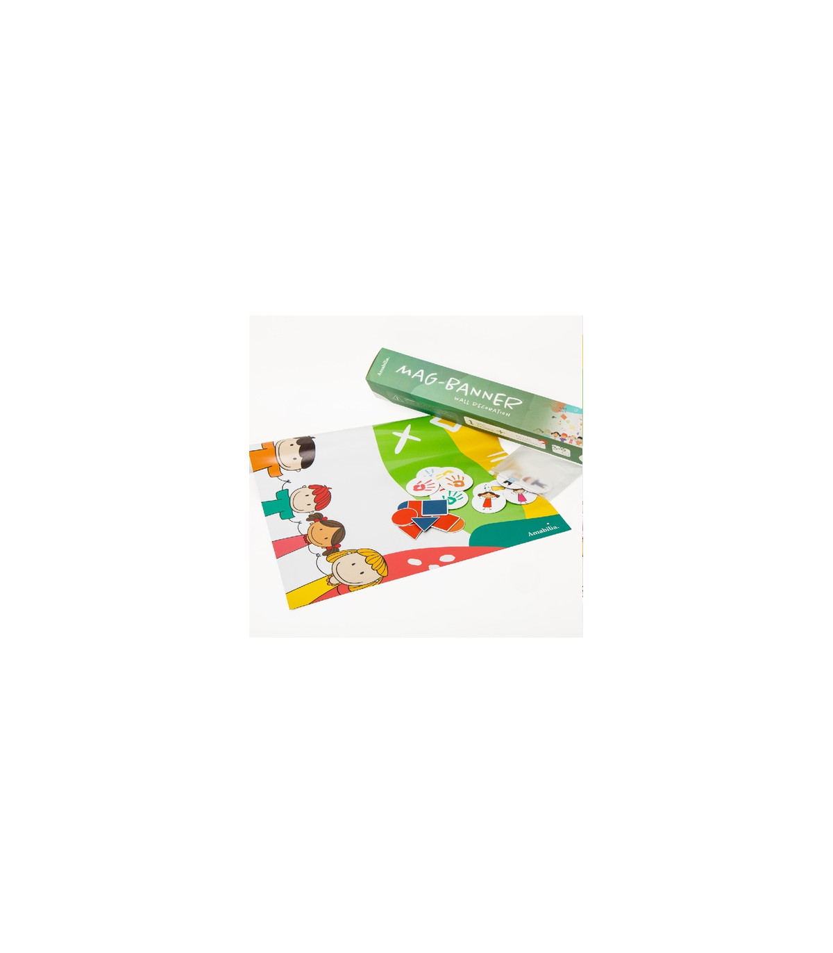 Incluye: 1 Banner Magnético de 125 cm x 50 cm para piso y pared 32 fichas imantadas ( 6 Personajes + 4 Manos + 22 Formas geométricas a todo color )+ 2 velcros de fácil montado que no dañan las paredes + 1 caja de regalo para guardarlo y transportarlo.