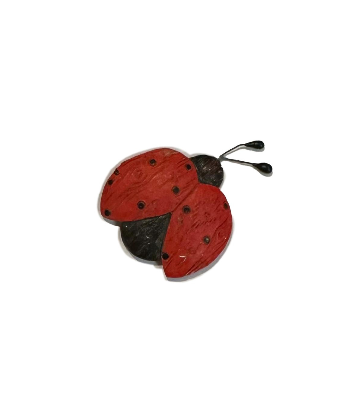 Un adorno de madera con forma de Vaquita de San Antonio con un imán debajo, para decorar.