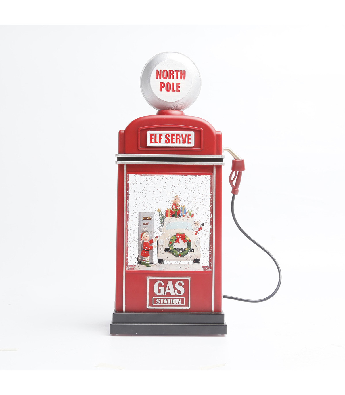 Un adorno de Navidad de 29.2 cm de alto y 11.4 cm de ancho en forma de surtidor con una escena navideña llena de agua y purpurina que al prenderla o agitarla parece nevar y luz LED a pilas (no incluidas). Ideal para decorar tu casa en Navidad.