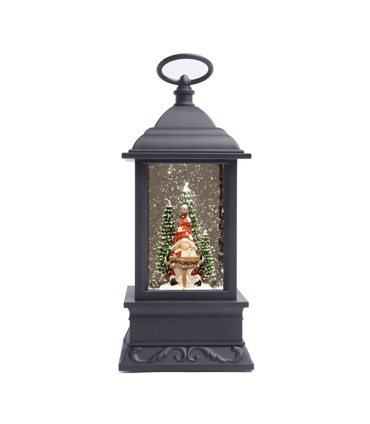 Un adorno de Navidad de 23 cm de alto en forma de farol con una escena navideña de un duende llena de agua y purpurina que al prenderla o agitarla parece nevar con luz LED a pilas (no incluidas). Ideal para decorar tu casa en Navidad.