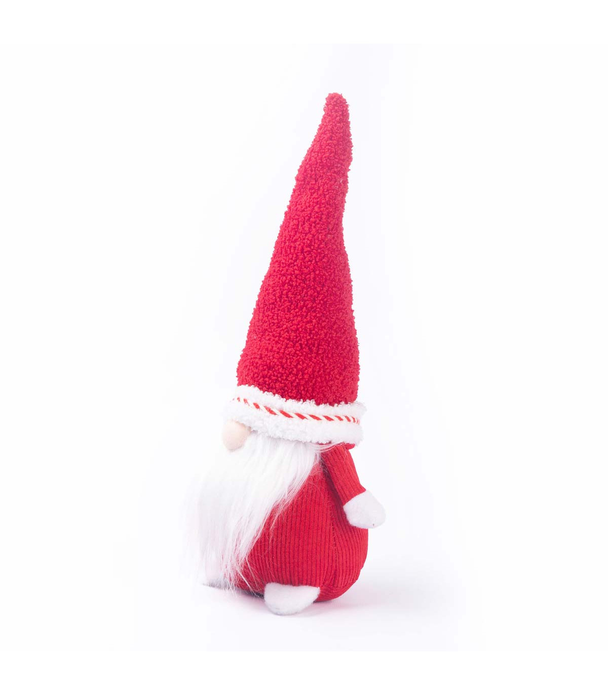 Un adorno con forma de duende navideño de 39 cm de alto hecho en tela. Con luz LED a pila (2 CR2032 no incluidas) y toda la magia de Alparamis para decorar tu casa en Navidad.