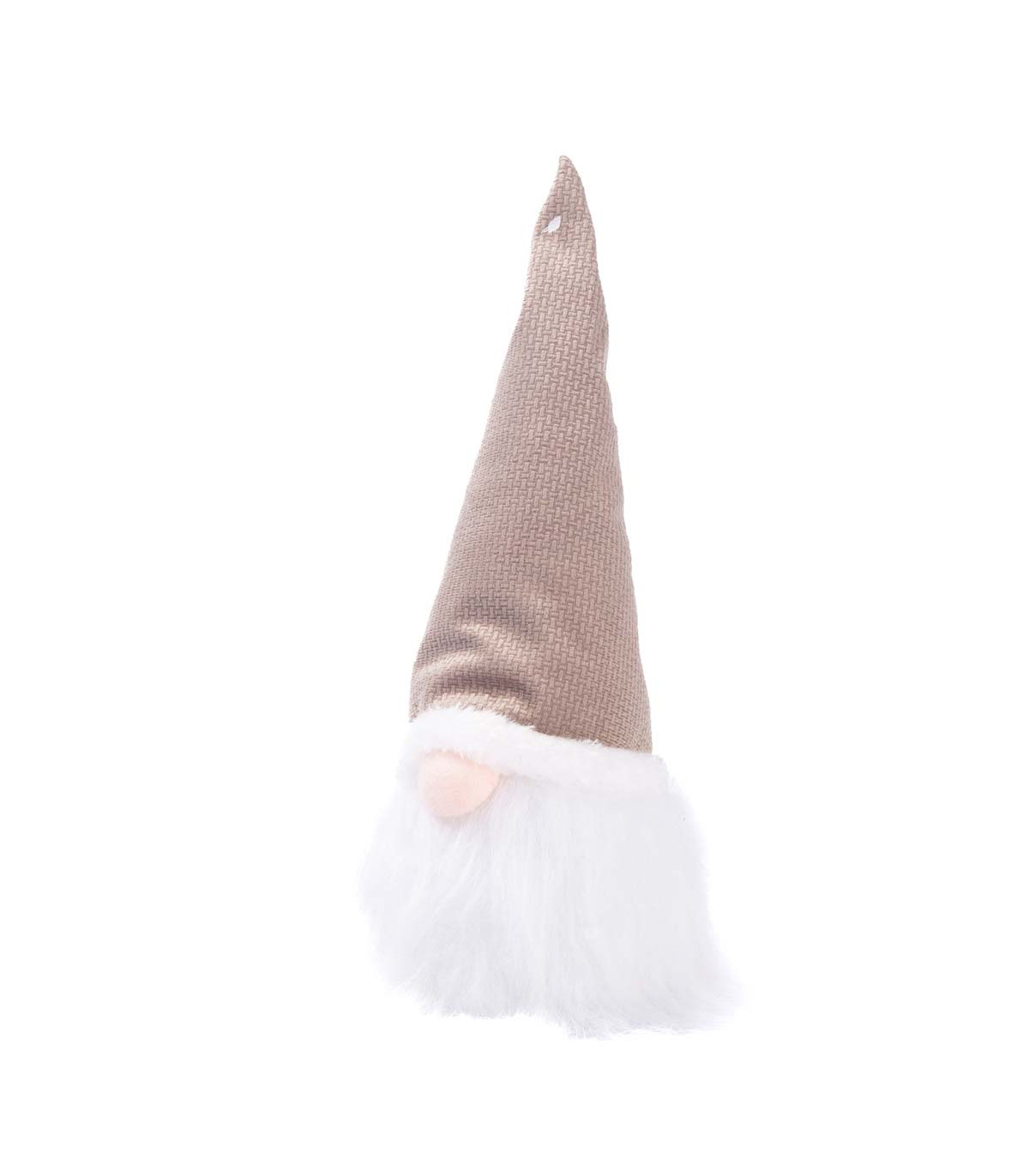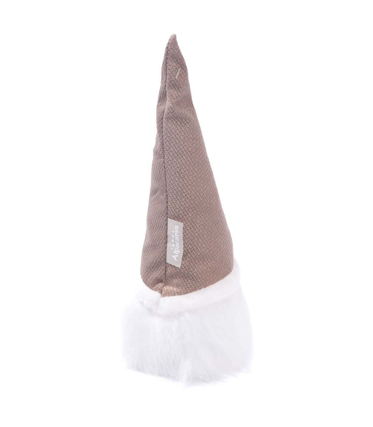 Un adorno con forma de cabeza de duende navideño de 30 cm de alto hecho en tela. Con luz LED a pila (1 CR2032 no incluida) y toda la magia de Alparamis para decorar tu casa en Navidad.