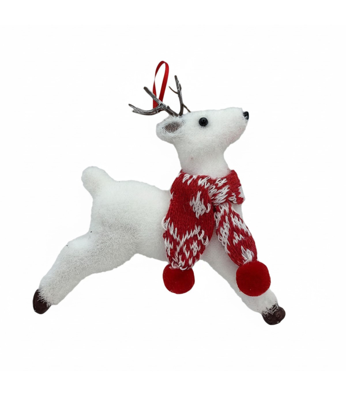Un adorno navideño con forma de reno decorativo con bufanda de 28 cm de largo y 16 cm de alto, ideal para ambientar espacios navideños con un toque tierno y festivo. Excelente para decorar estantes o mesas.