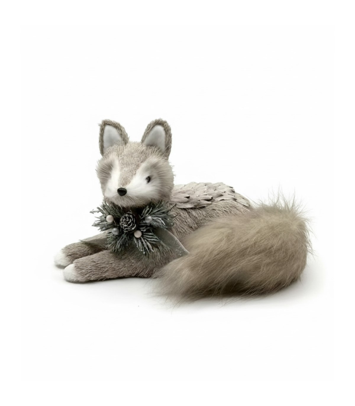 Un adorno navideño con forma de zorro de 29 cm de ancho y 20 cm de alto. Ideal para agregar un toque natural y nórdico a tu hogar en Navidad. Perfecto para vitrinas, mesas o repisas.