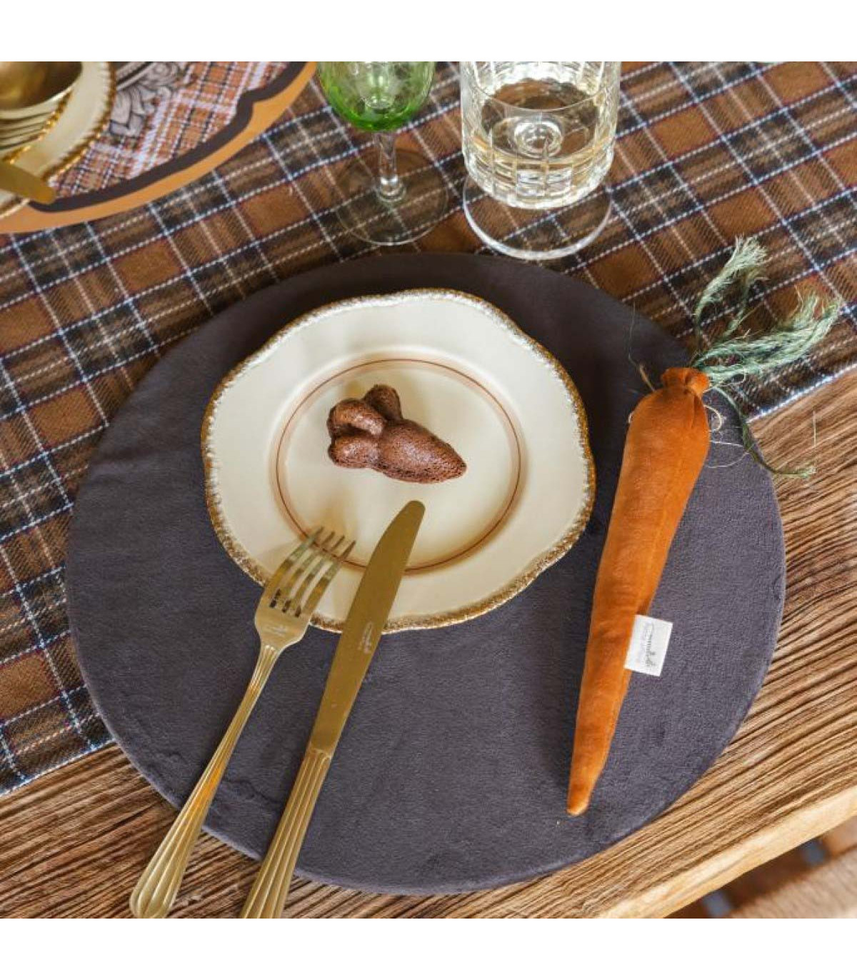 Pack de 3 zanahorias decorativas hechas en velvet, en tonos cálidos que aportan textura y encanto a la mesa o a cualquier rincón del hogar. Cada una incluye follaje textil y terminaciones cuidadas, para una ambientación de Pascua simple y elegante.