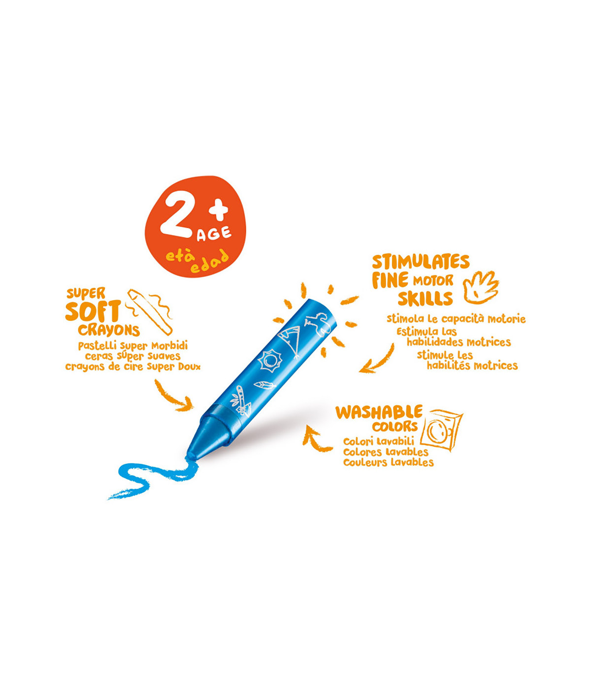 Una caja de 8 crayones Baby para chicos a partir de los 24 meses. Cuerpo de gran dimensión que facilita el agarre y escritura supersuave. Colores brillantes y lavables. Acuarelables si se mezclan con agua y pincel.