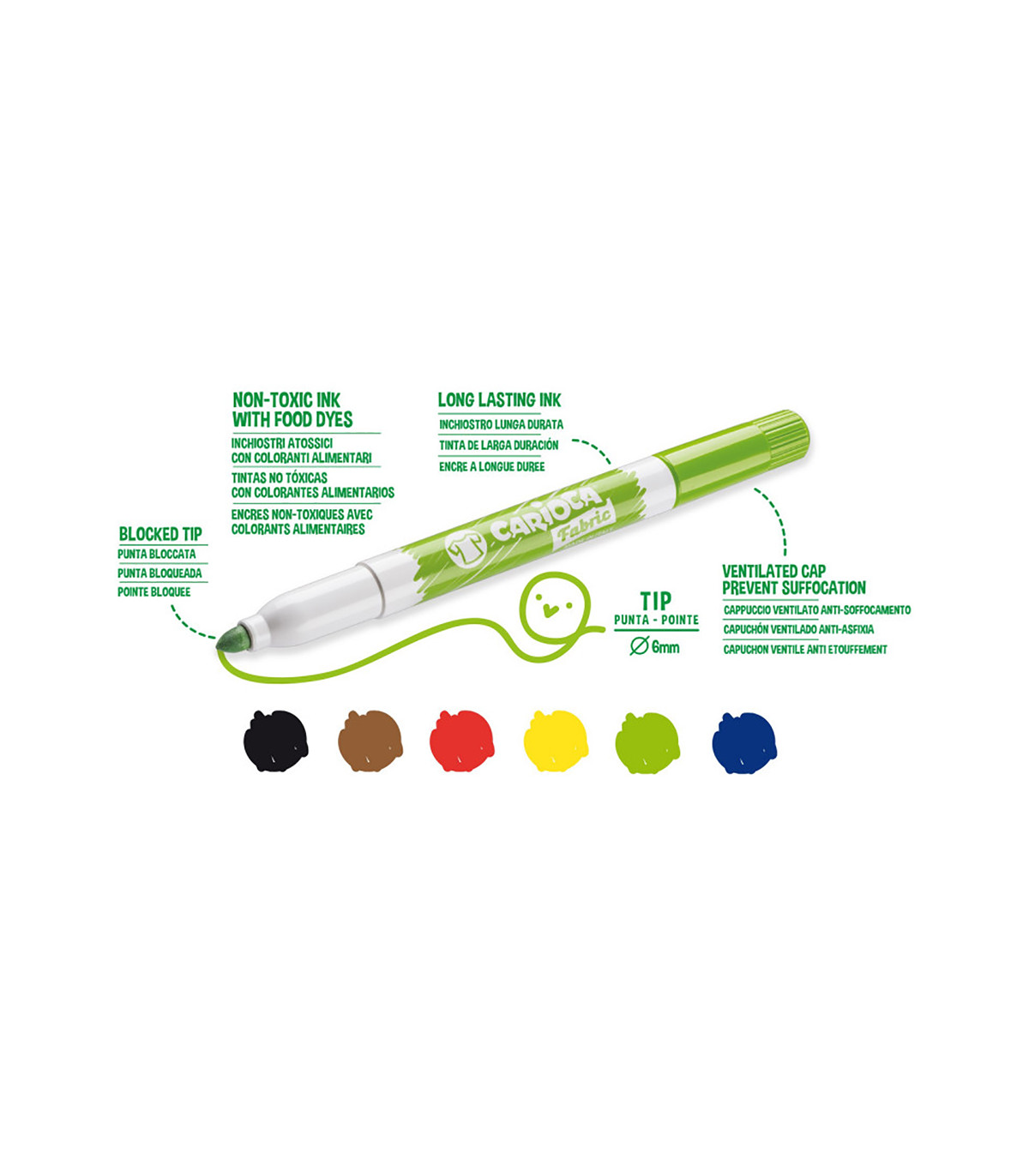 Una caja de 6 marcadores Fabric para tela. Punta Maxi de 6 mm. Tinta especial para tejidos. Una vez aplicados, los colores son indelebles. Para mantener una mayor duración y brillo de los colores se aconseja planchar sobre el reverso del dibujo terminado.