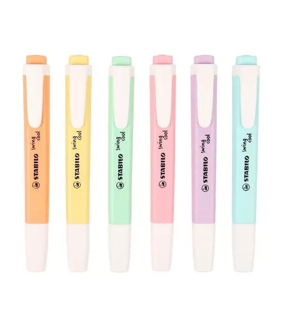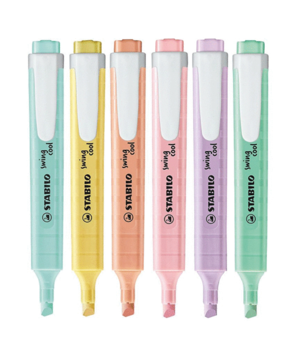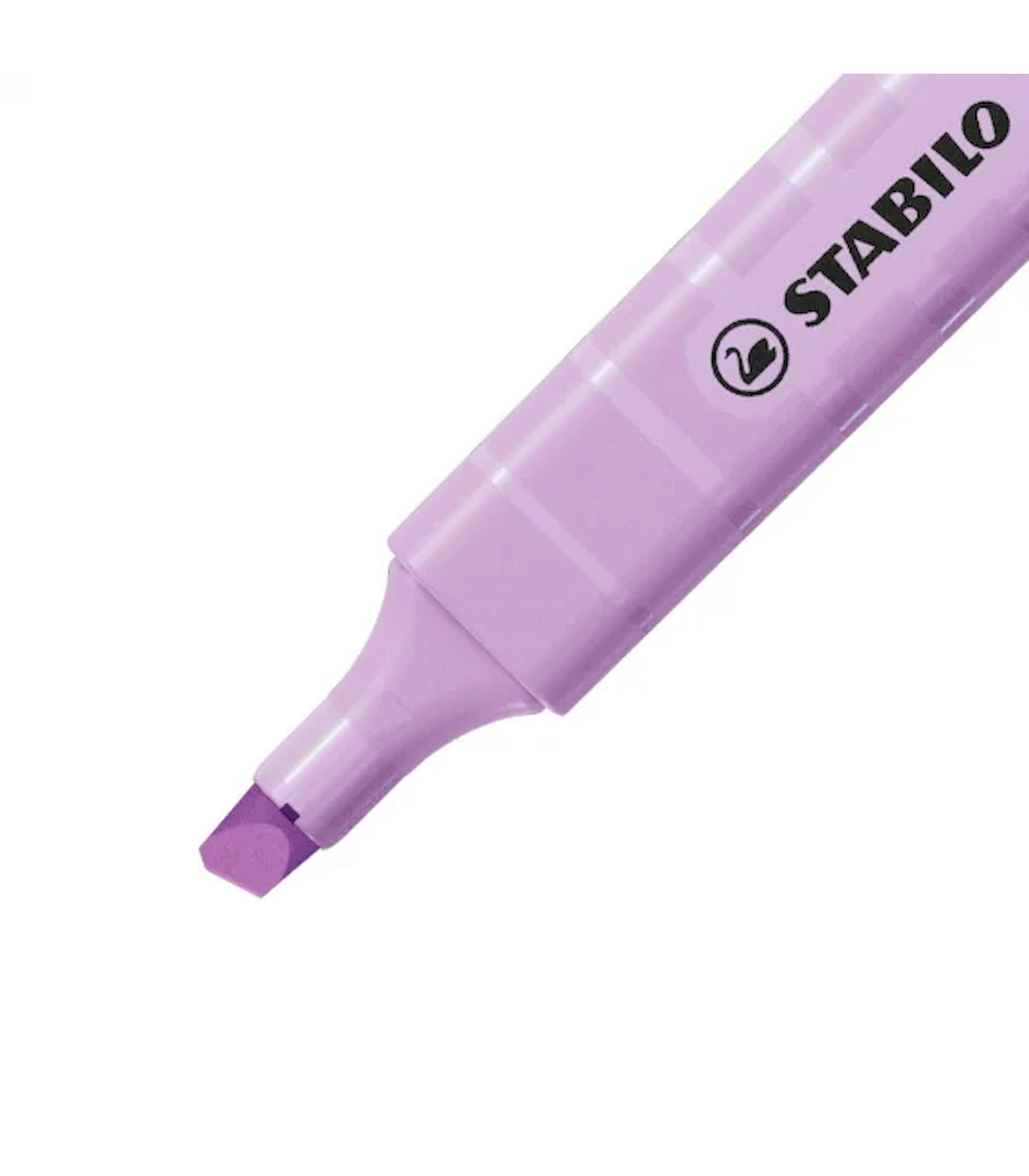 Resaltadores Stabilo planos de colores pastel con dos anchos de trazo, 1 mm y 4 mm. Tinta a base de agua y capuchón con clip. Tecnología anti secado por 4 horas sin capuchón.