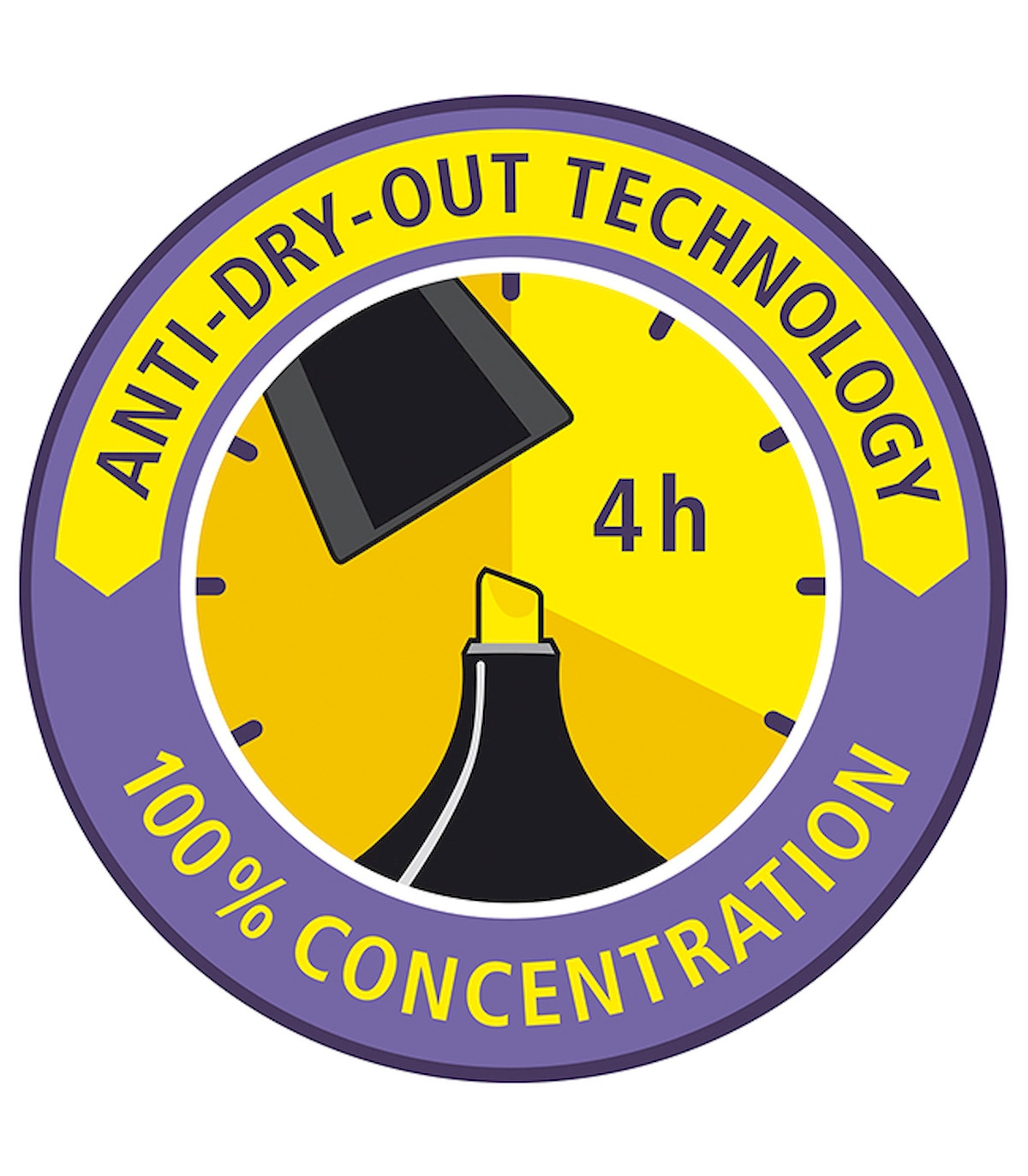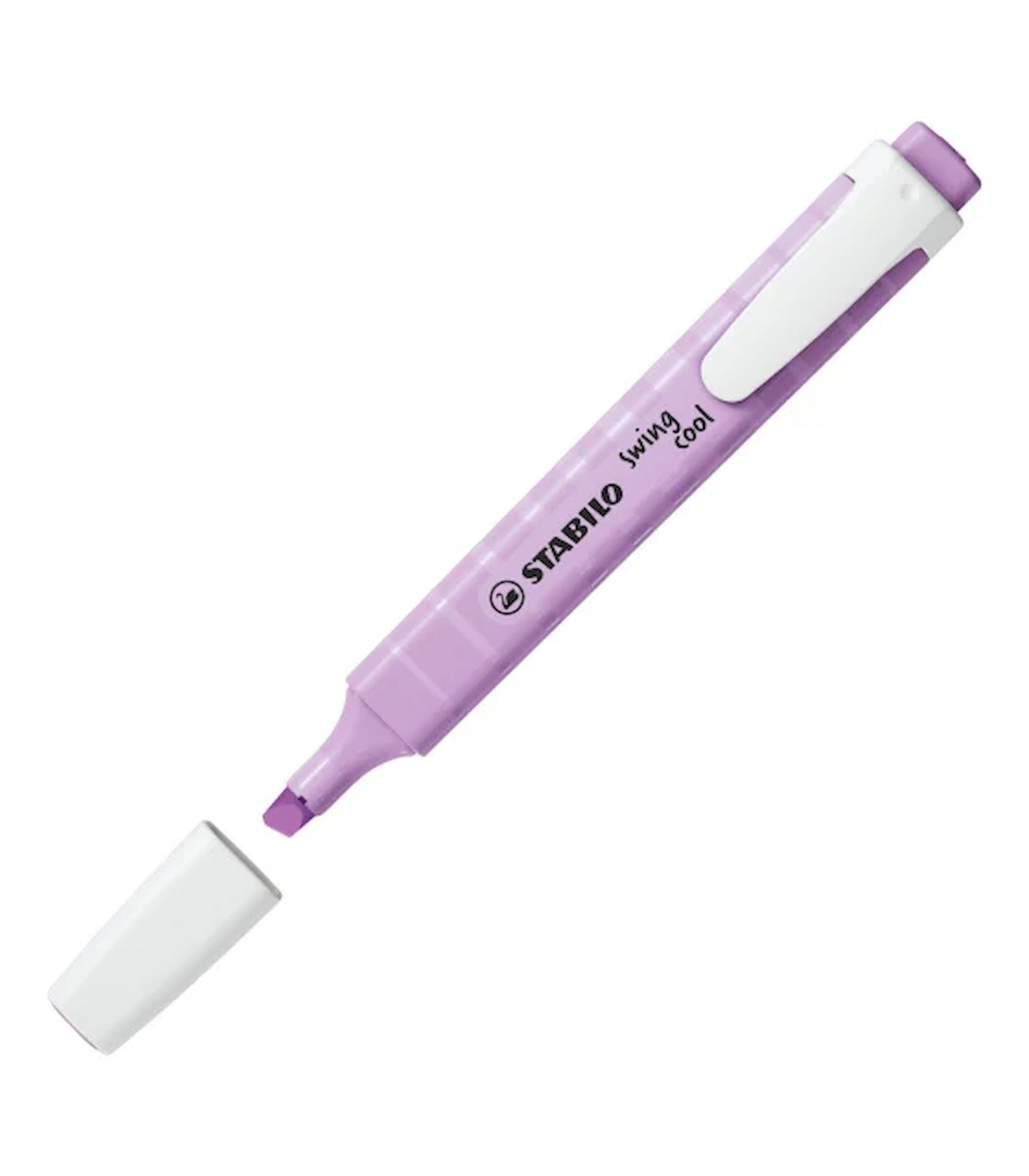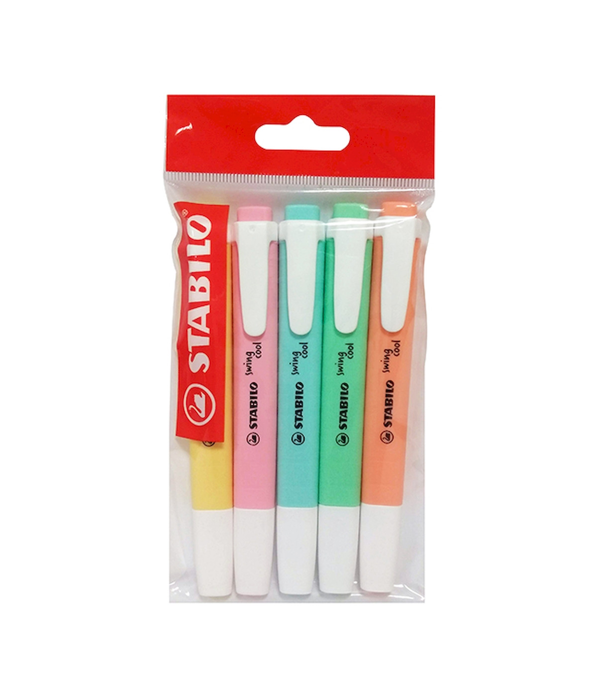 Resaltadores Stabilo planos de colores pastel con dos anchos de trazo, 1 mm y 4 mm. Tinta a base de agua y capuchón con clip. Tecnología anti secado por 4 horas sin capuchón.