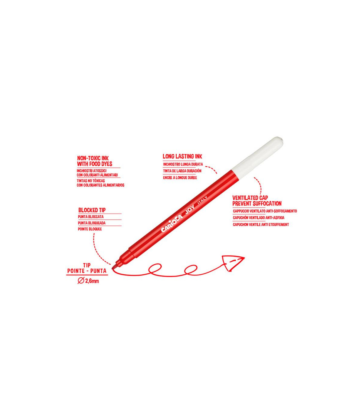 Una caja de 6 marcadores Joy de punta fina de 2.6 mm y tinta durable superlavable. Tinta no tóxica, con colorantes alimentarios y dermatológicamente testeada. Colores brillantes. Capuchón ventilado anti-asfixia.