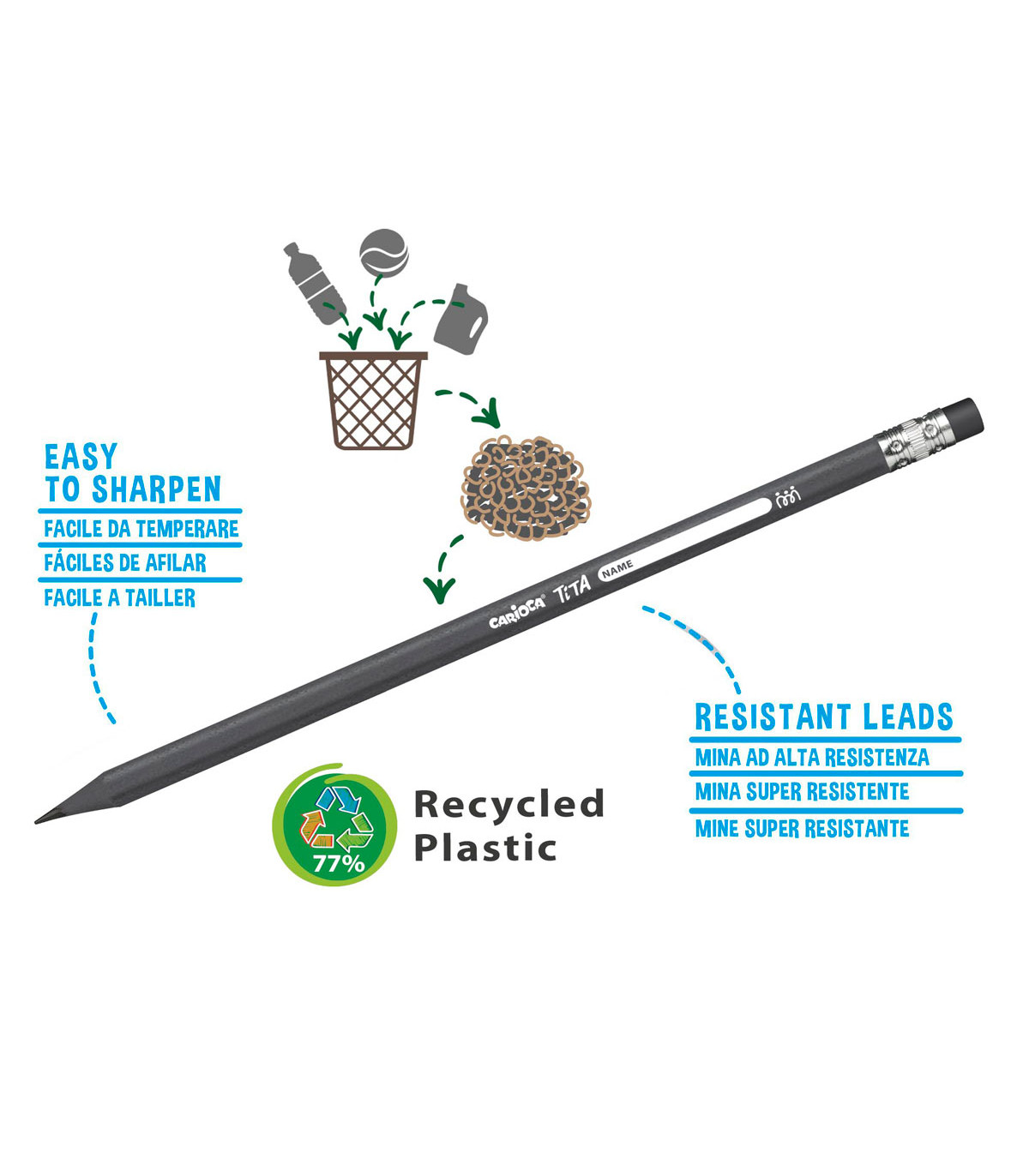 Una caja con 6 lápices HB fabricados con un 77% de plástico reciclado. Cuerpo hexagonal y goma incorporada en la parte posterior. La mina es de 3 mm de diámetro, segura y resistente a las caídas. No se astilla si se rompe.