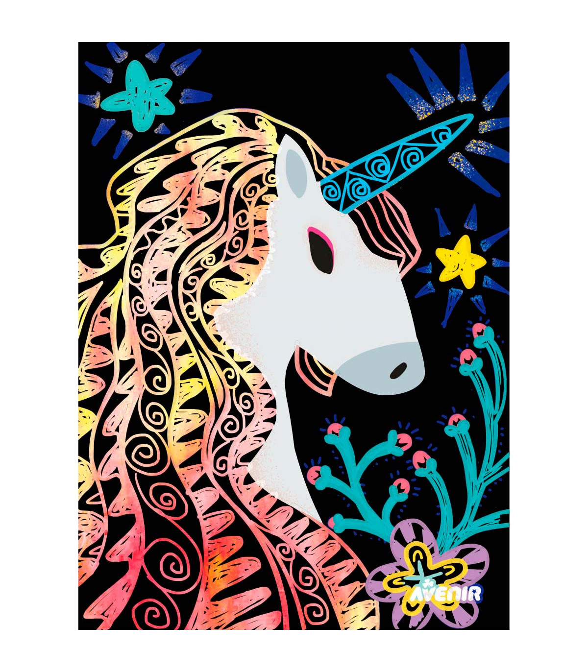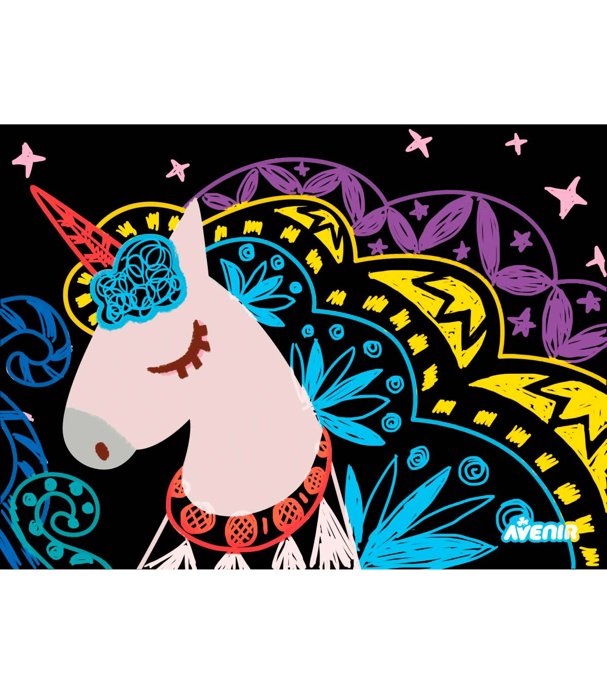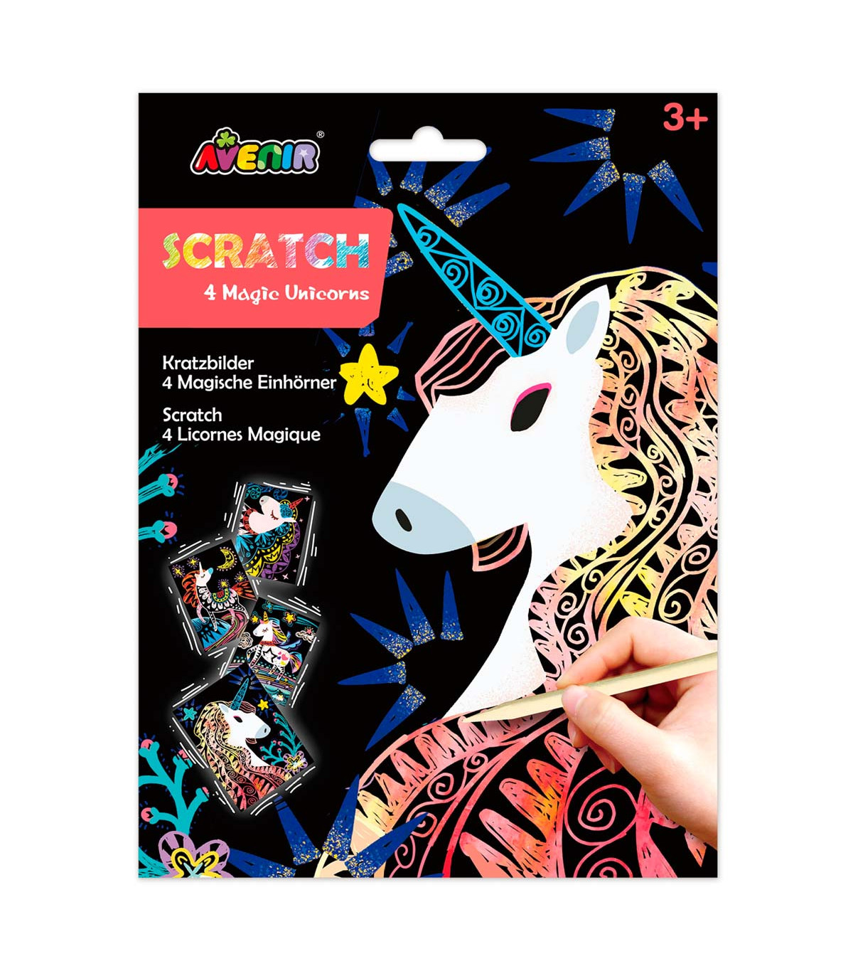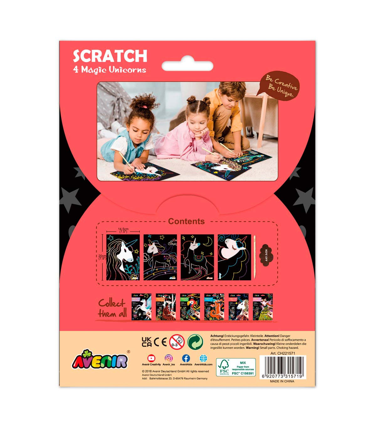 Creá hermosas obras de arte raspando la superficie negra con el lápiz para raspar incluido para descubrir un diseño asombroso de colores brillantes. Incluye cuatro hojas diferentes para raspar.