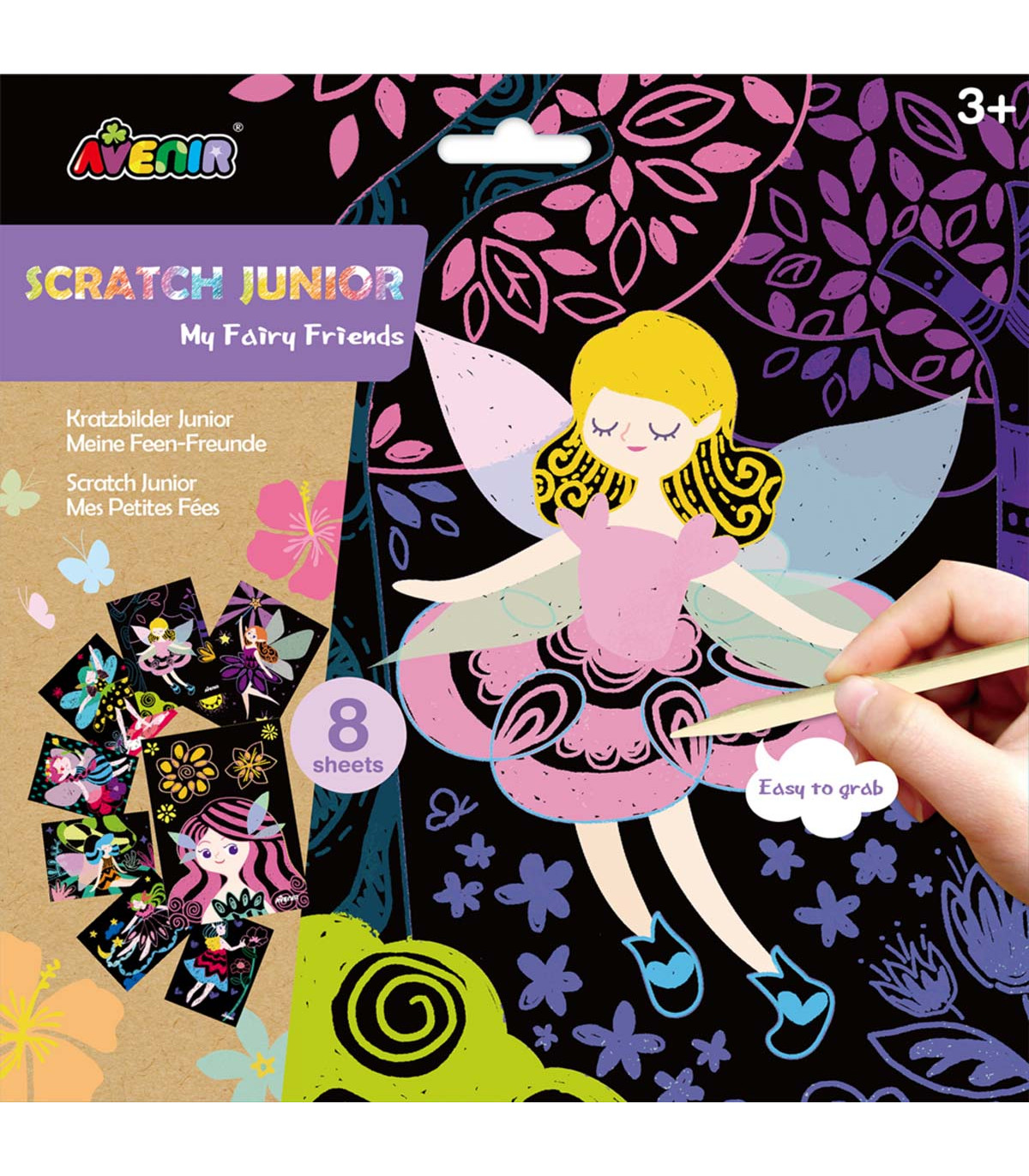 Arte scratch diseñado para los más pequeños. Contiene 8 láminas de colores con diseños para descubrir raspando la capa negra y un lápiz especial para raspar. Edad a partir de 3 años.