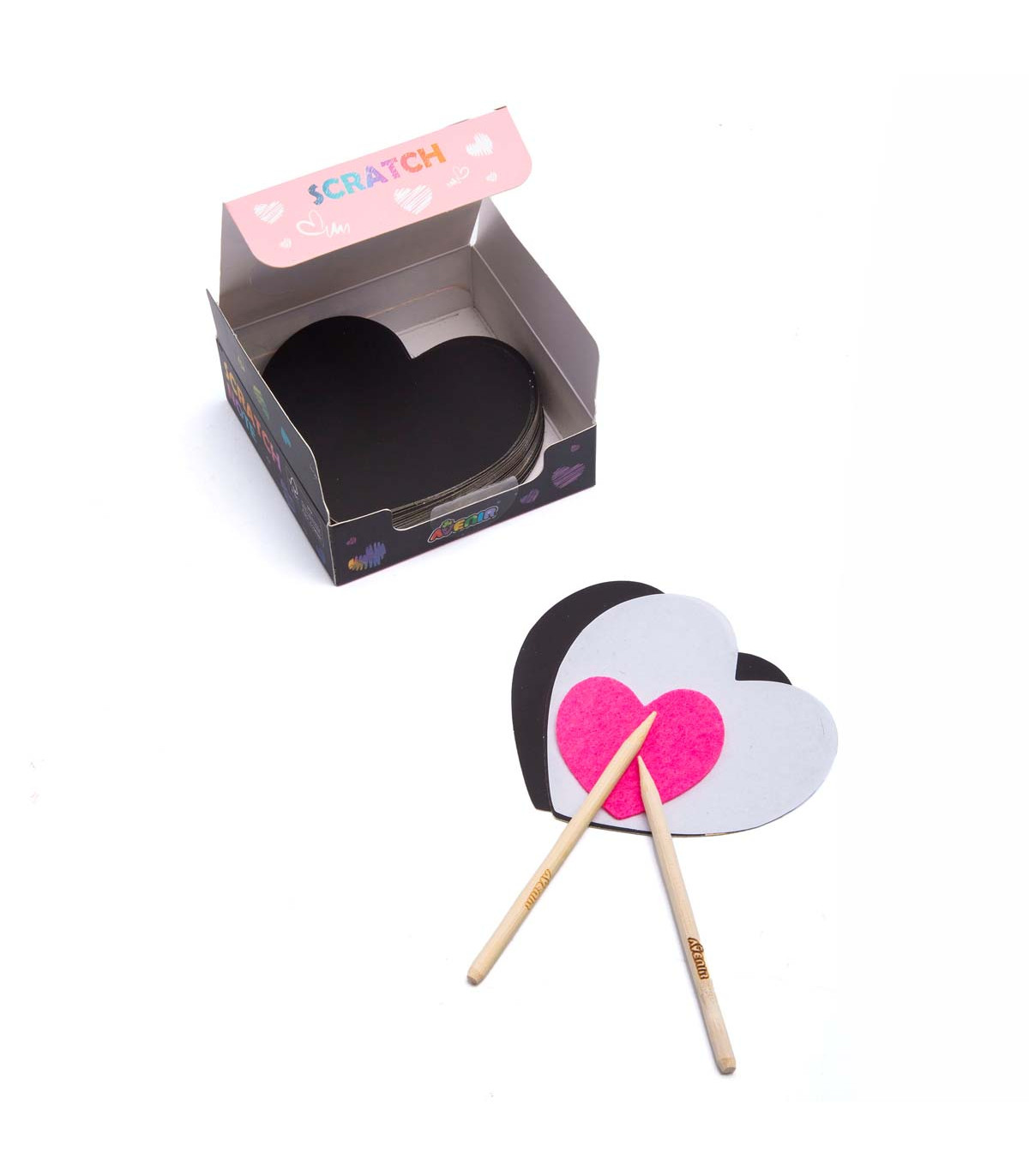 Simpático block de notas para raspar con forma de corazón para que crees una obra de arte. Sólo raspá la capa negra para revelar los divertidos colores que hay debajo. Incluye 2 lápices especiales para raspar y 50 hojas.