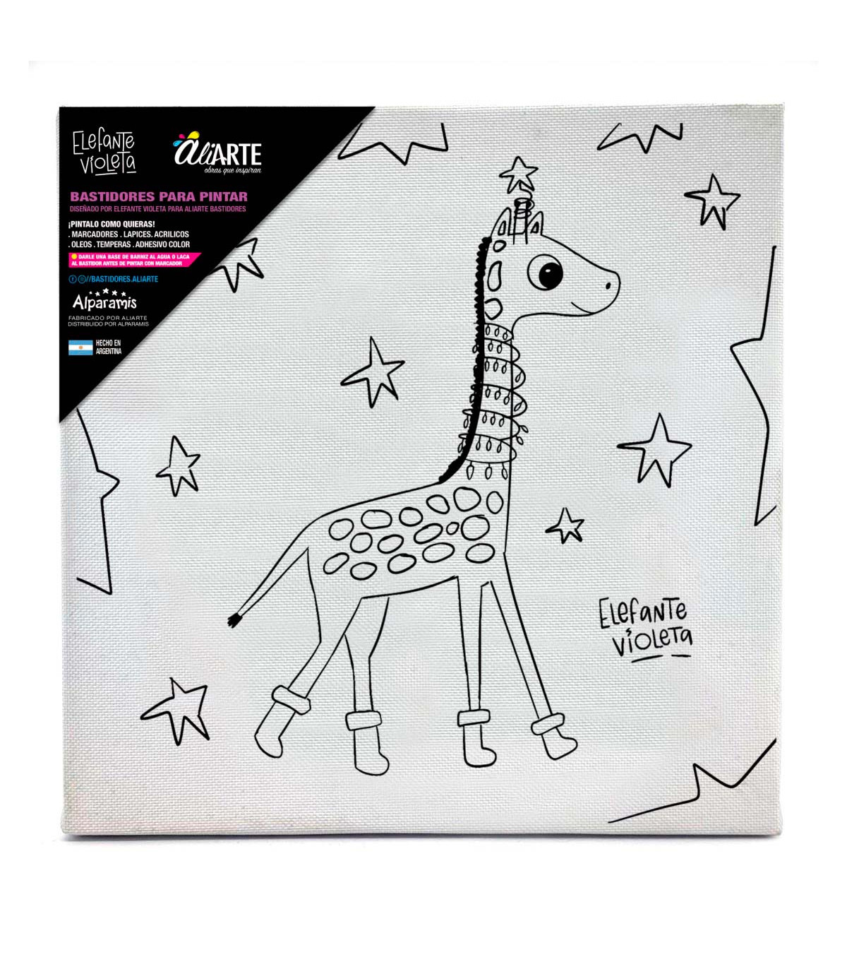 Un bastidor de tela de 20 x 20 cm de Aliarte con una obra navideña dibujada por la artista plástica Carolina Macellaro, conocida como Elefante Violeta, para que los chicos pinten una obra maestra de Navidad.