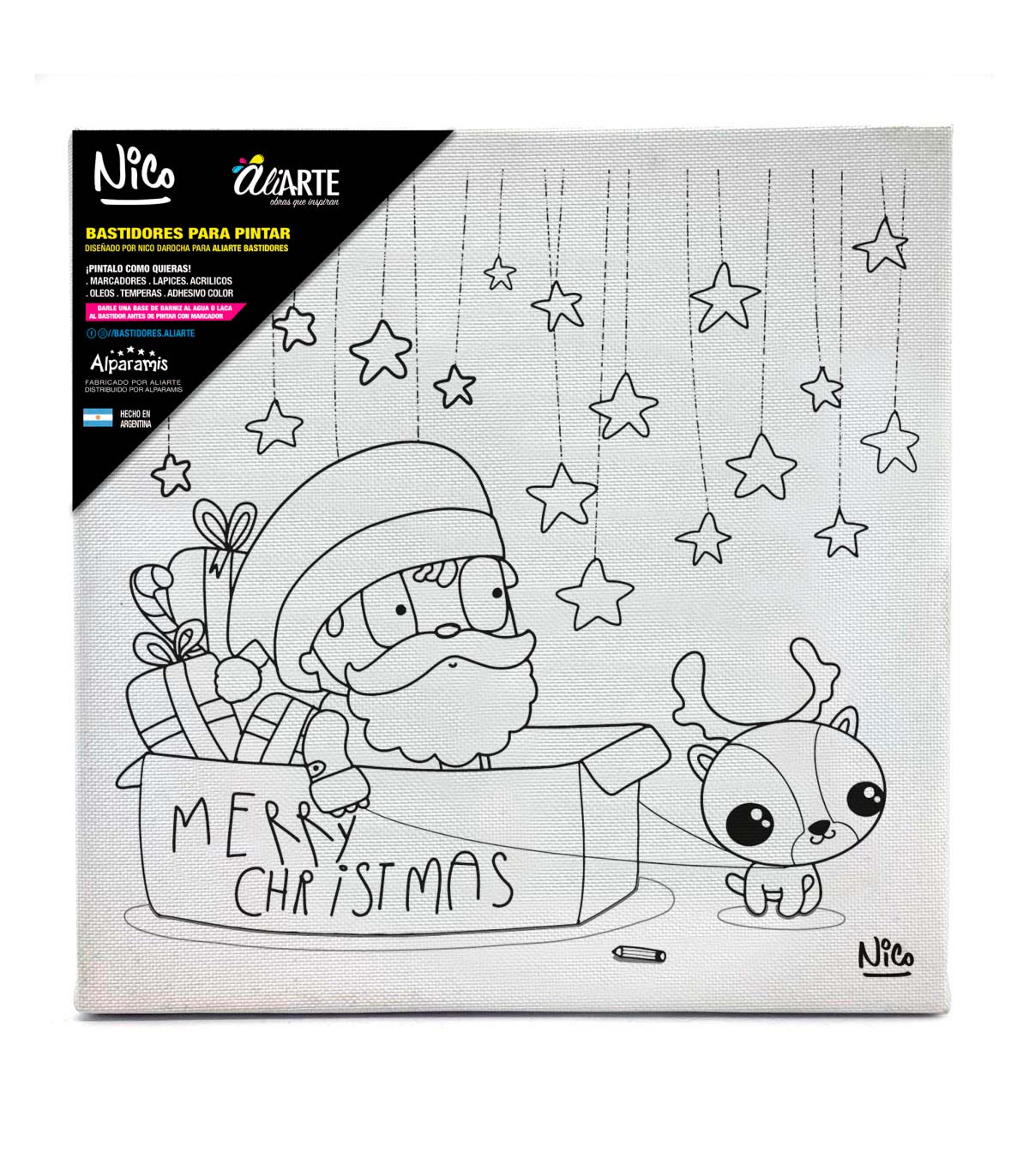 Un bastidor de tela de 20 x 20 cm de Aliarte con una obra navideña dibujada por el artista plástico Nico da Rocha para que los chicos pinten una obra maestra de Navidad.