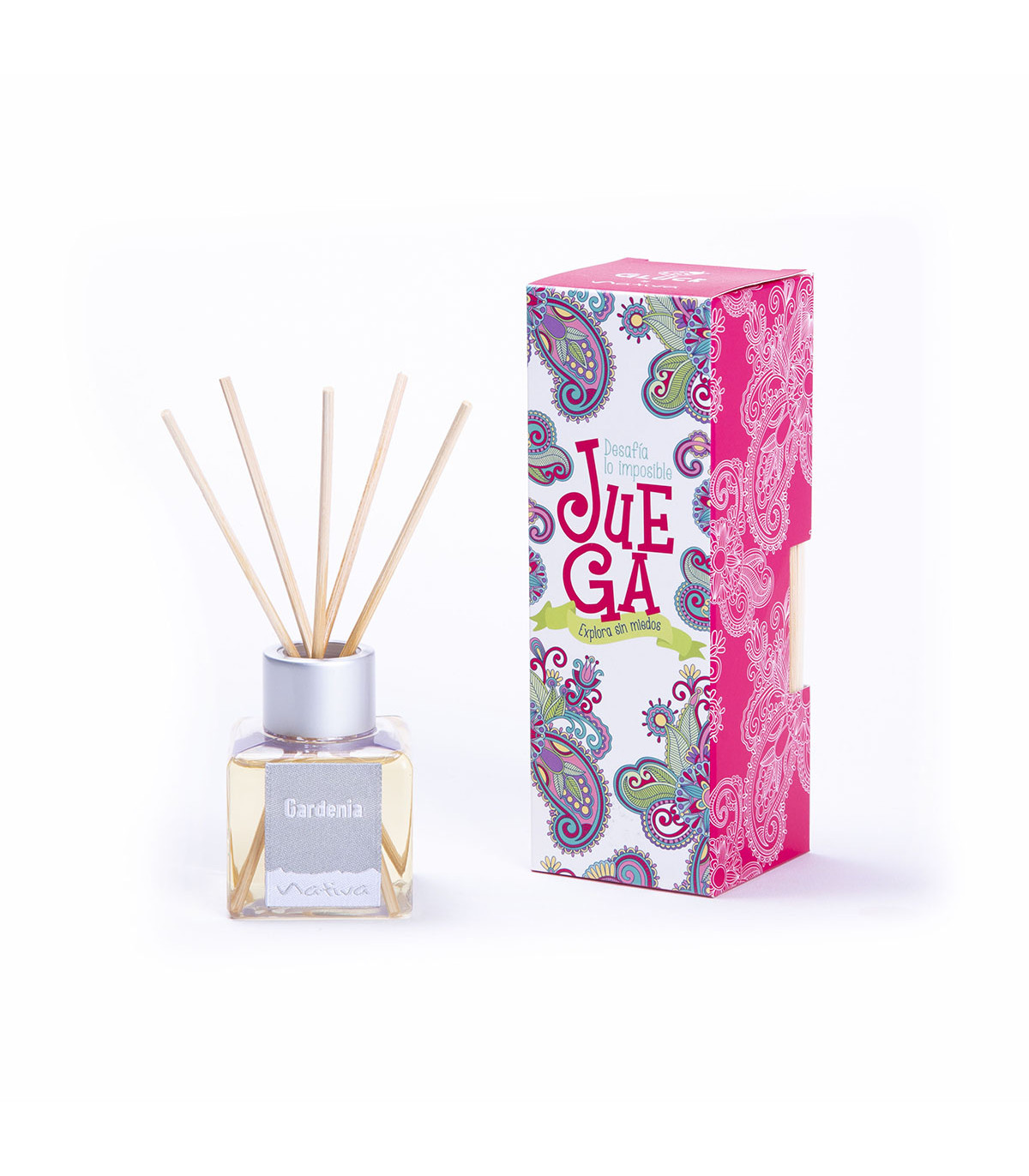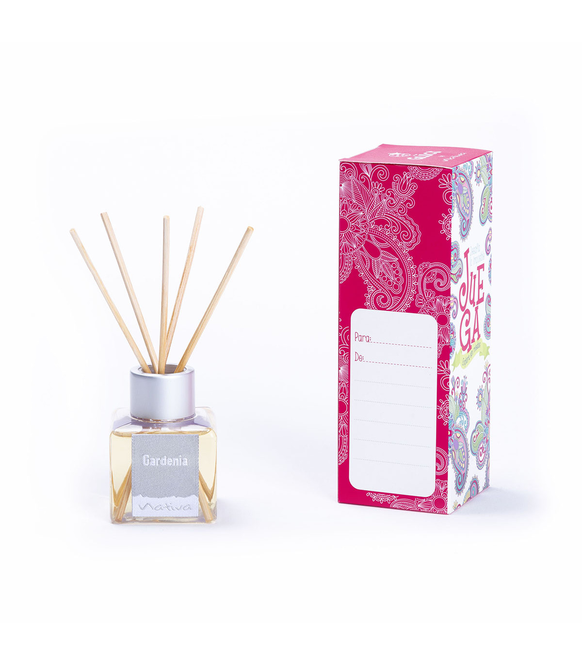 Una caja-tarjeta con un mensaje para dedicar que contiene una pequeña sorpresa: un difusor ambiental con fragancia gardenia. Medidas del difusor: 70 cm3. Medidas de la caja: 5,3 cm de base cuadrada x 15 cm de alto. Colección: Simples secretos. Diseño: