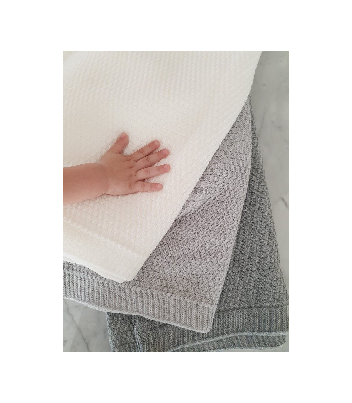Manta tejida en hilo dralon, con hermoso diseño en punto santa clara. Confección y terminaciones de calidad. Ideal para llevar a tu bebé en su huevito o cochecito, taparlo en su cuna o abrigarlo en cualquier momento.