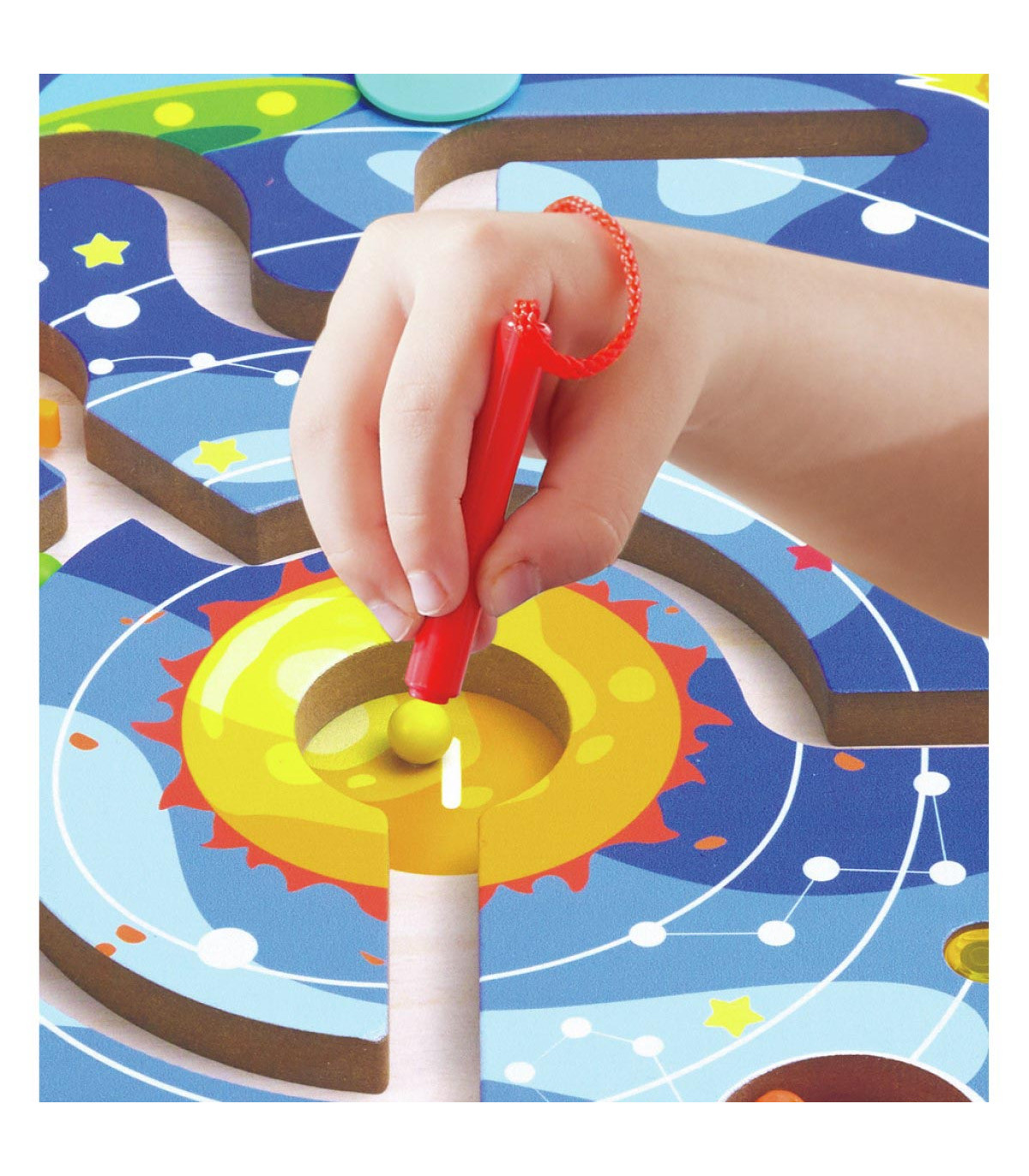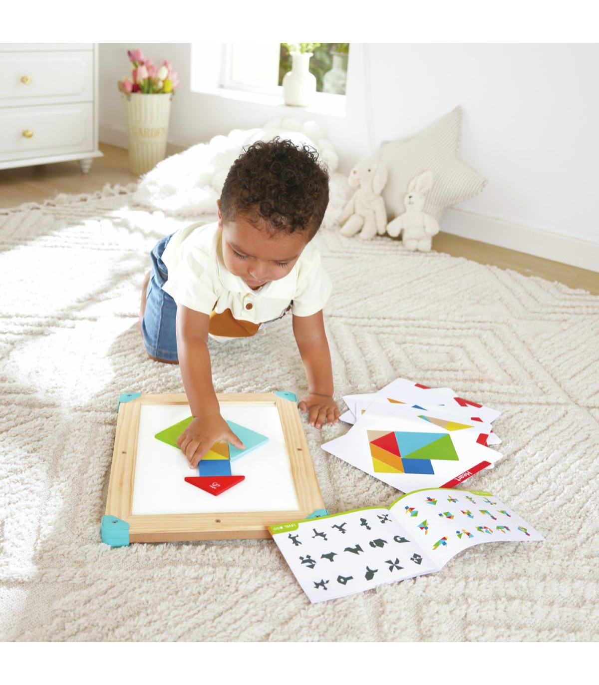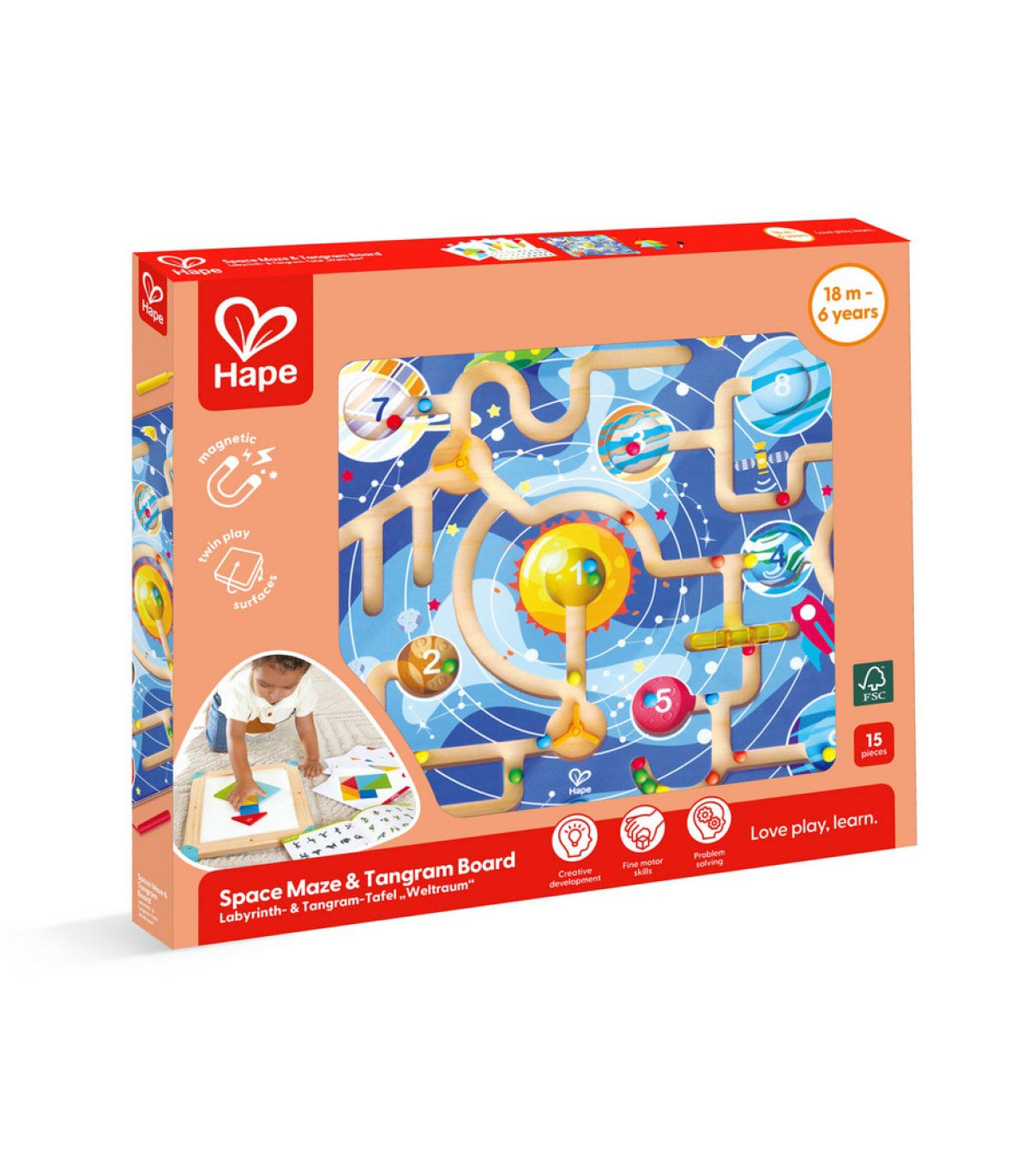 Juguete 2 en 1 diseñado para crecer con tu hijo. Por un lado, un laberinto espacial magnético que refuerza las habilidades motoras finas y la coordinación mano-ojo. Por el otro, un rompecabezas tangram progresivo y una pizarra blanca integrada.