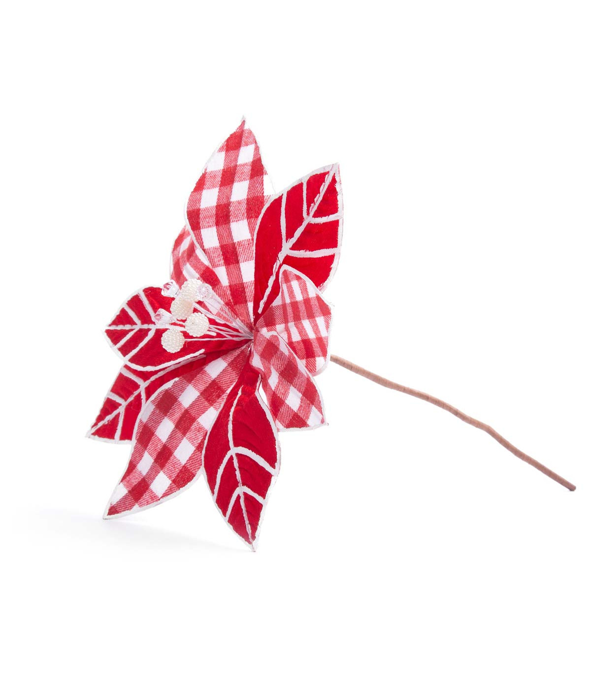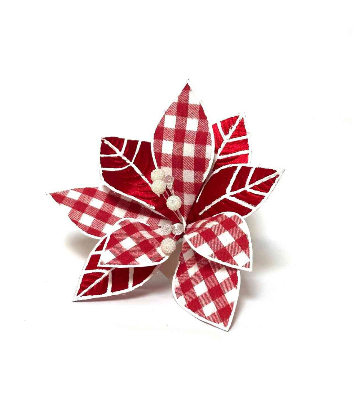 Un adorno con forma de flor de Estrella Federal a cuadrille de 24 cm de diámetro hecho en tela poliéster, platico y alambre para decorar el árbol de Navidad.