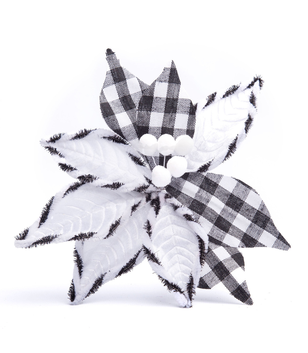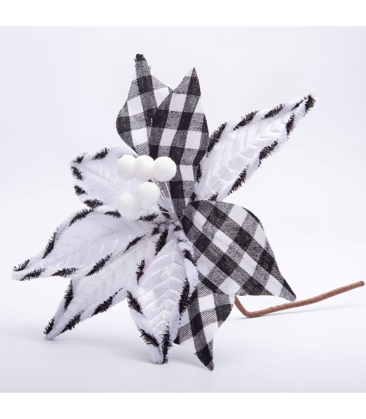 Un adorno con forma de flor de Estrella Federal a cuadrille de 22 cm de diámetro hecho en tela poliéster y alambre para decorar el árbol de Navidad.