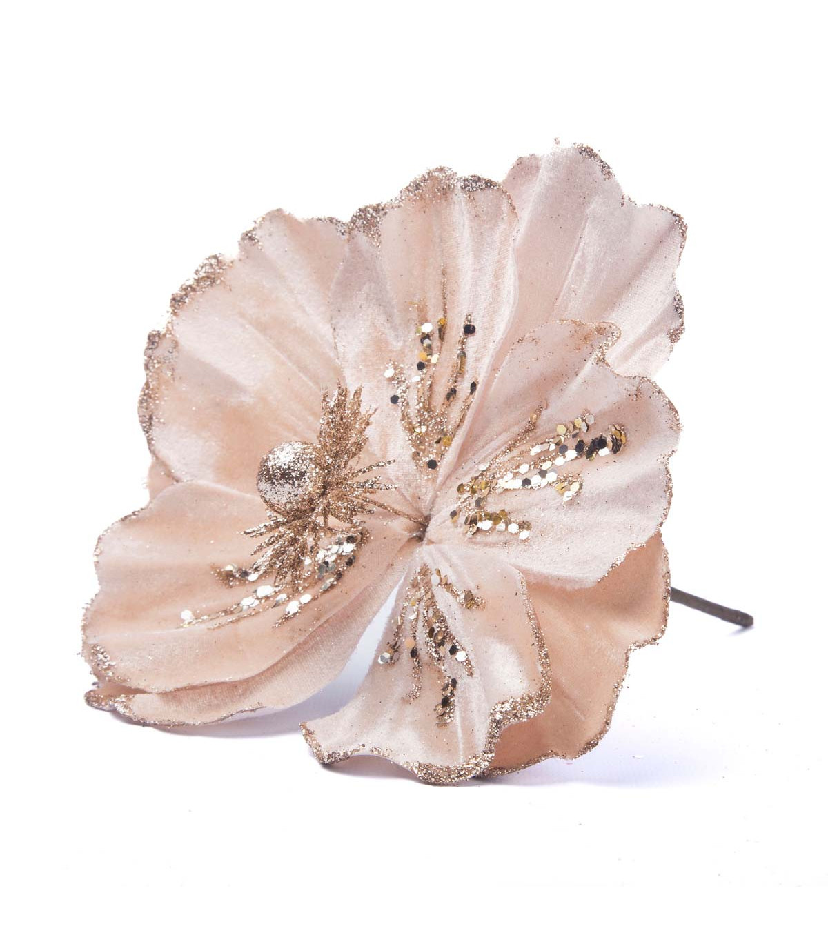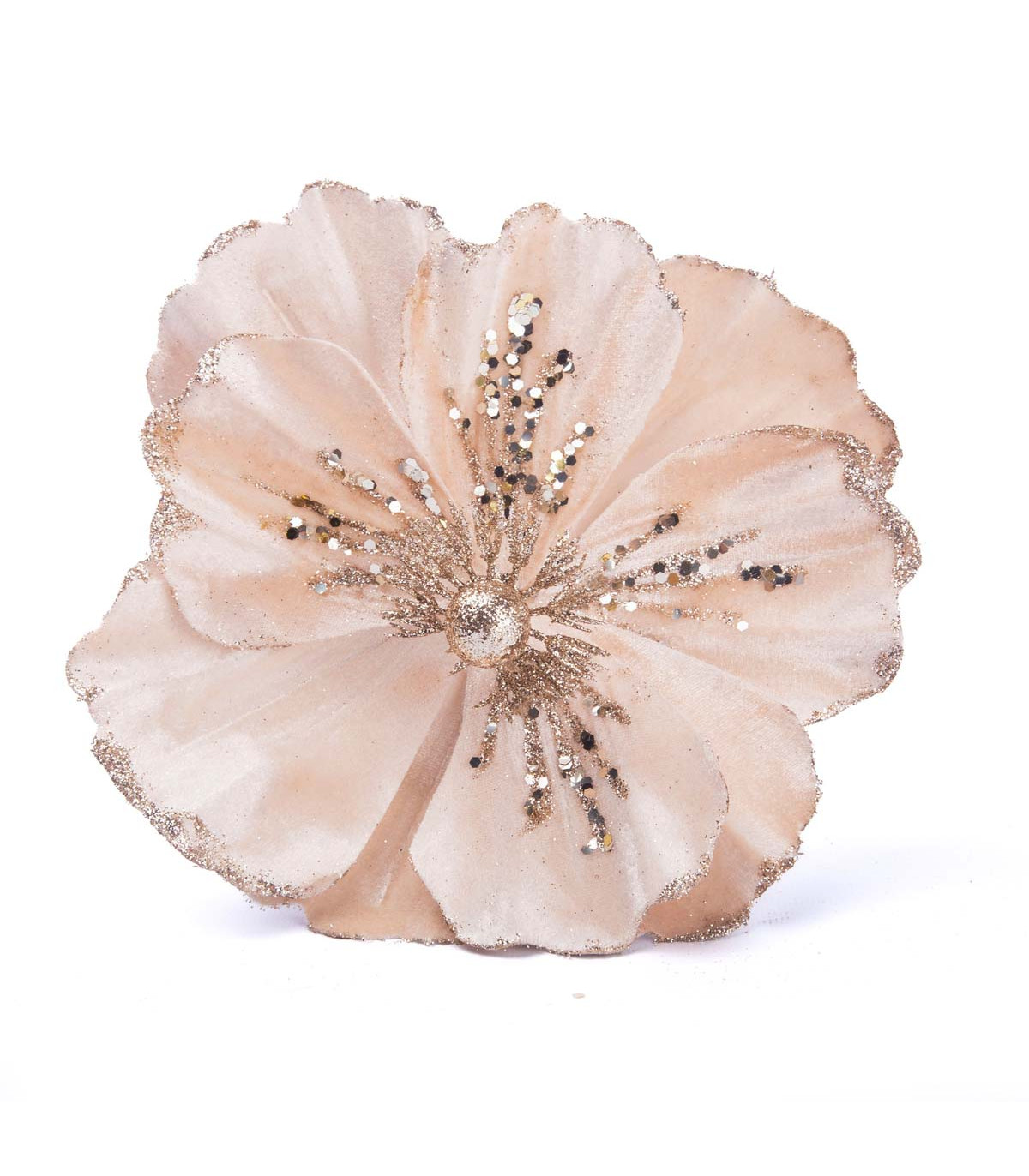Un adorno con forma de flor Poinsettia de 22 cm de diámetro hecho en tela poliéster, plástico y alambre. Ideal para decorar el árbol de Navidad con toda la magia de Alparamis.