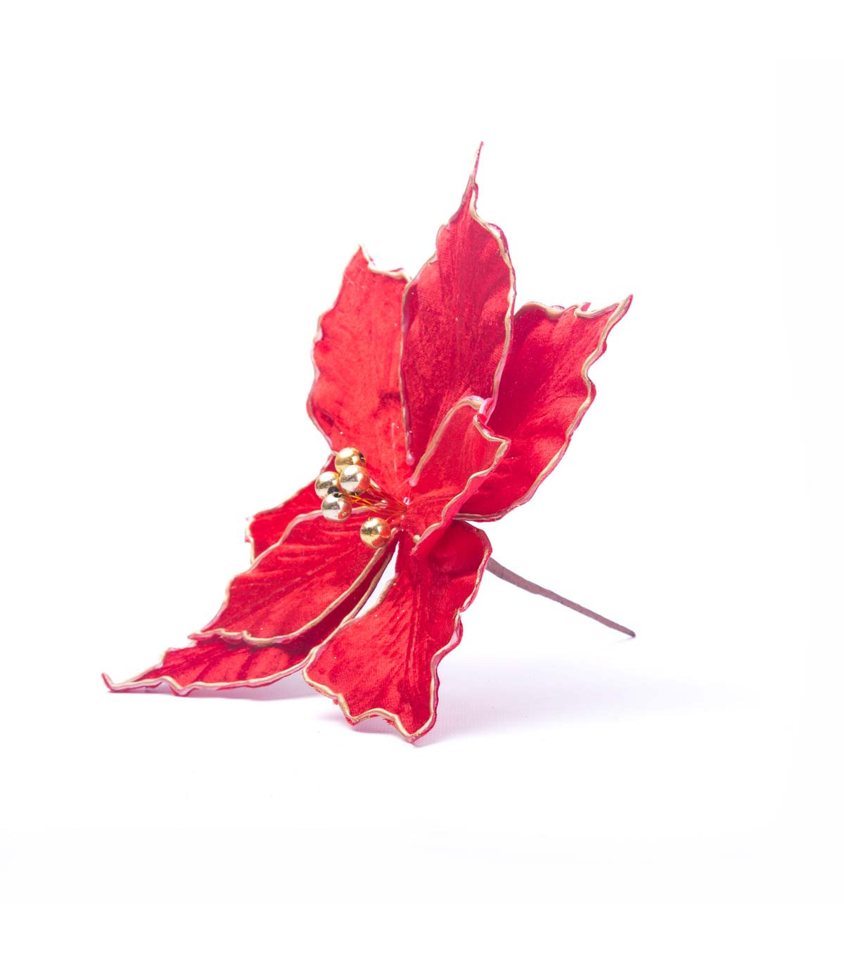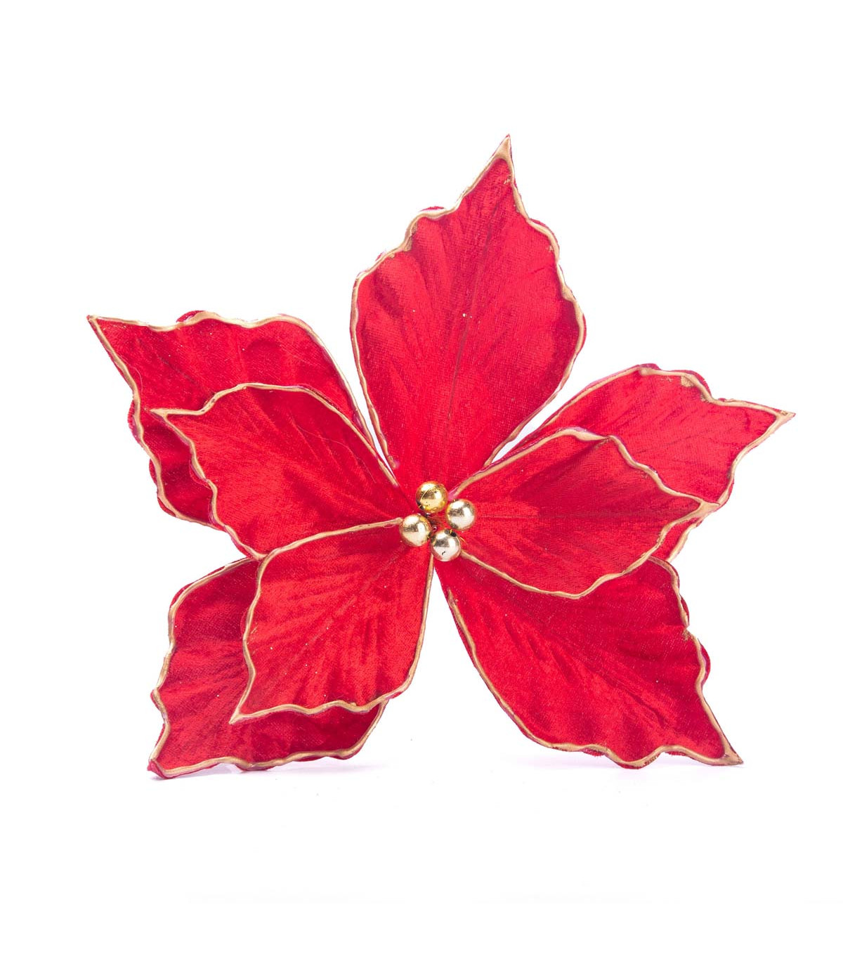 Un adorno con forma de flor de Estrella Federal de 30 cm de diámetro hecho en tela poliéster, plástico y alambre. Ideal para decorar el árbol de Navidad con toda la magia de Alparamis.