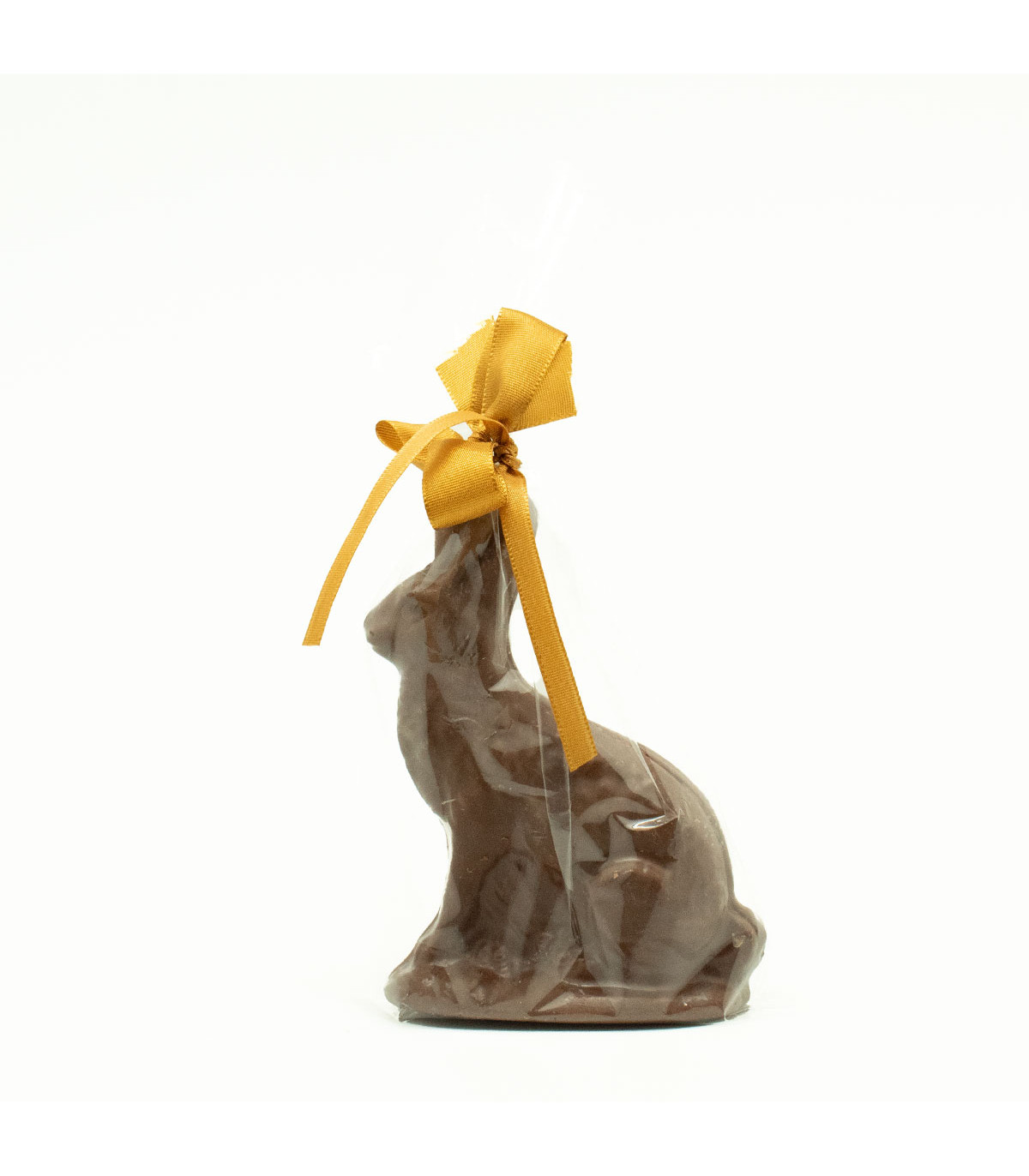 Un conejo de Pascua de chocolate con leche artesanal de 60 gr relleno de minigalletitas bañadas en chocolate, con toda la Magia de Alparamis.