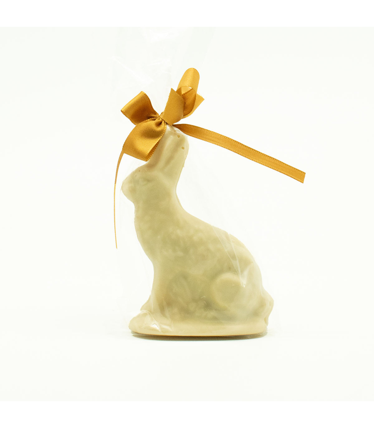 Un conejo de Pascua de chocolate blanco artesanal de 60 gr relleno de minigalletitas bañadas en chocolate, con toda la Magia de Alparamis.