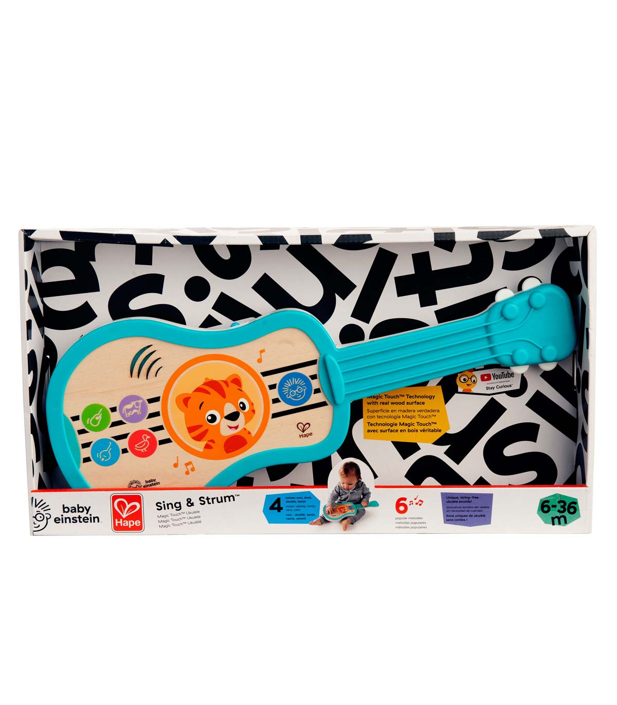 Ukelele con superficie de madera magic touch que suena cuando el bebé rasguea. Toca 6 canciones populares clásicas con el botón Blue Einstein. 4 timbres diferentes, ukelele, banjo, vaca o pato. Introduce causa y efecto y desarrolla habilidades motoras.