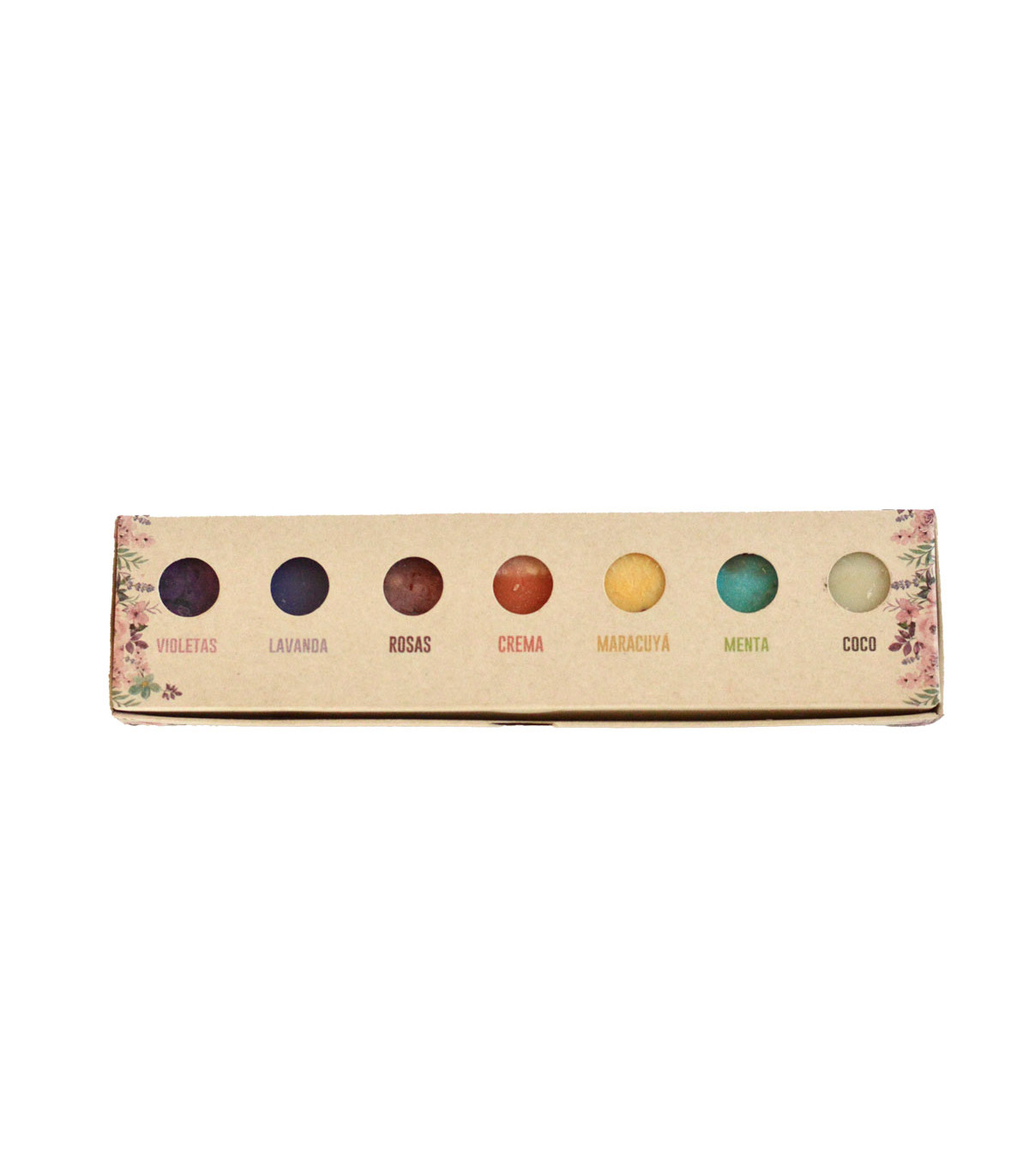 Esta caja, ideal para regalar, tiene una degustación de 7 jabones sólidos: Nébula (de violetas), Dormilón (de lavanda), Rosas, Suspiro Limeño (de crema y vainilla), Buenas Vibras (de maracuyá), Mentime Más (de menta y eucaliptus) y Coconut (de coco).