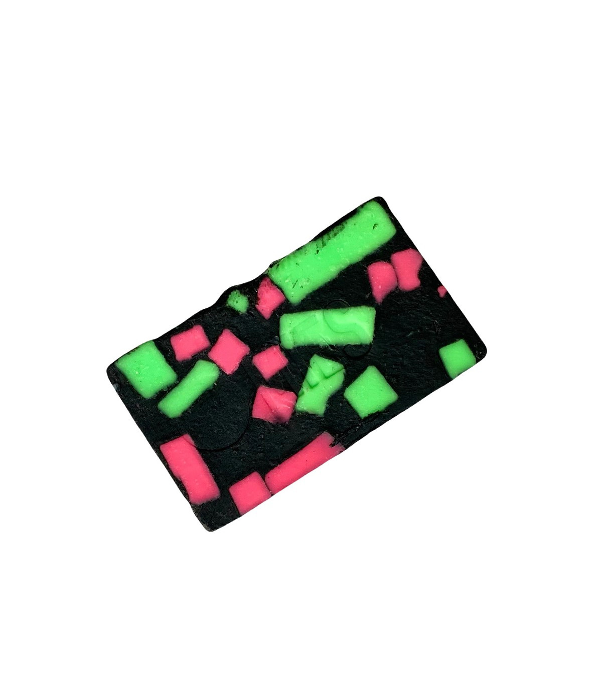 Un jabón sólido artesanal de 115 g de colores brillantes y carbón activado que absorbe naturalmente la grasa. Apto veganos y la saponificación es en frío.